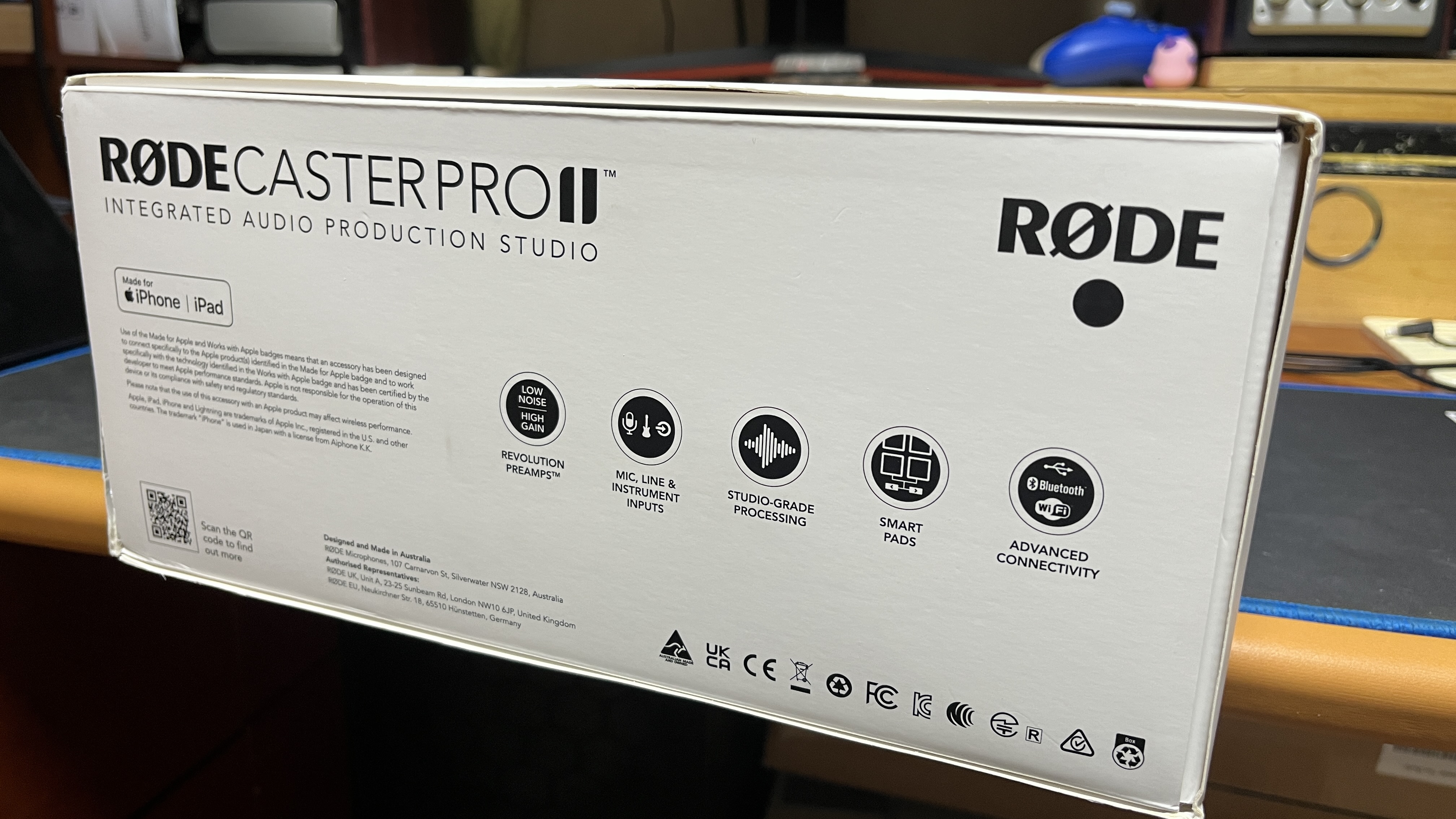 바로 반대쪽에도 거의 동일한 정보가 담겨 있지만, 각 국가별로 제품 인증을 받은 로고와 보다 많은 정보를 확인할 수 있는 QR코드가 인쇄되어 있다. 눈에 띄는 점으로는 RøDECaster Pro II가 MFI 인증을 받아 아이패드나 아이폰의 주변기기로서 원활하게 작동된다고 한다. 디지털 믹서에 MFI 인증이라. 조금 놀랐다.