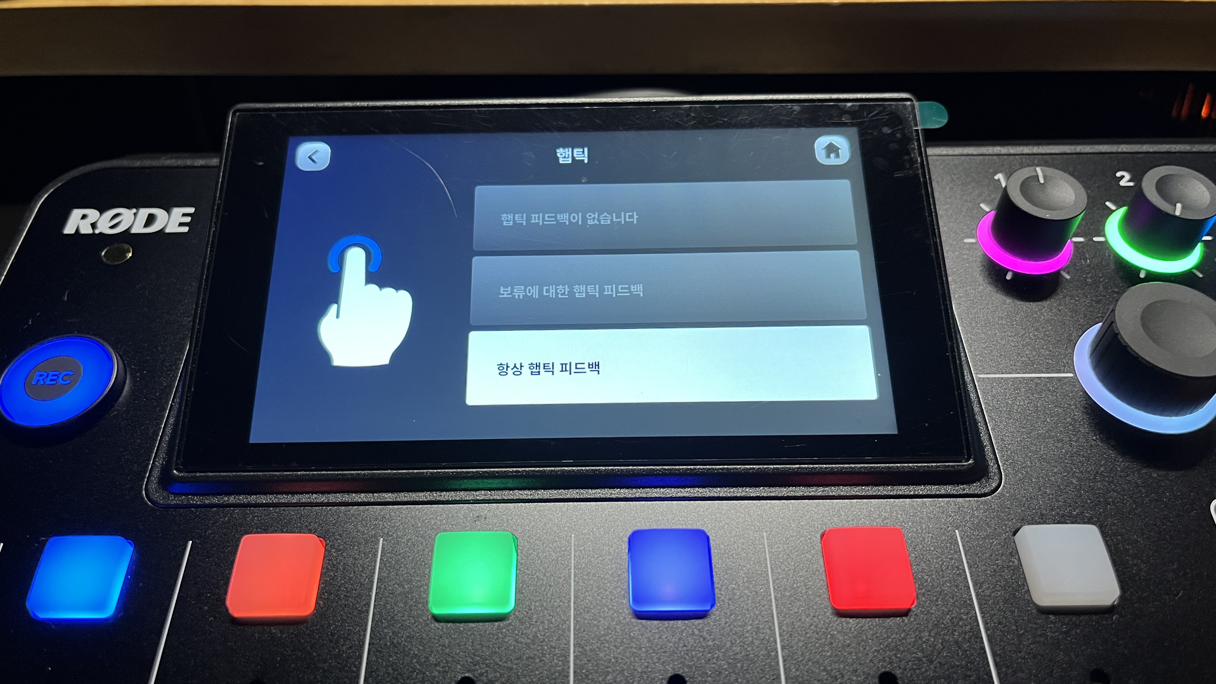 다음은 햅틱 피드백 설정이다. 기본적으로 RøDECaster Pro II는 햅틱 피드백을 지원해서 터치를 할 때마다 진동이 손가락으로 전달된다. 다만 기본값은 무언가 설정을 바꿀 때에만 적용되는지라 필자는 항상 햅틱 피드백이 되는 형태로 설정을 했다. 모든 걸 터치 인터페이스로 제어하는 RøDECaster Pro II 특성상 햅틱 피드백을 항상 켜고 사용하는 것을 권장한다.