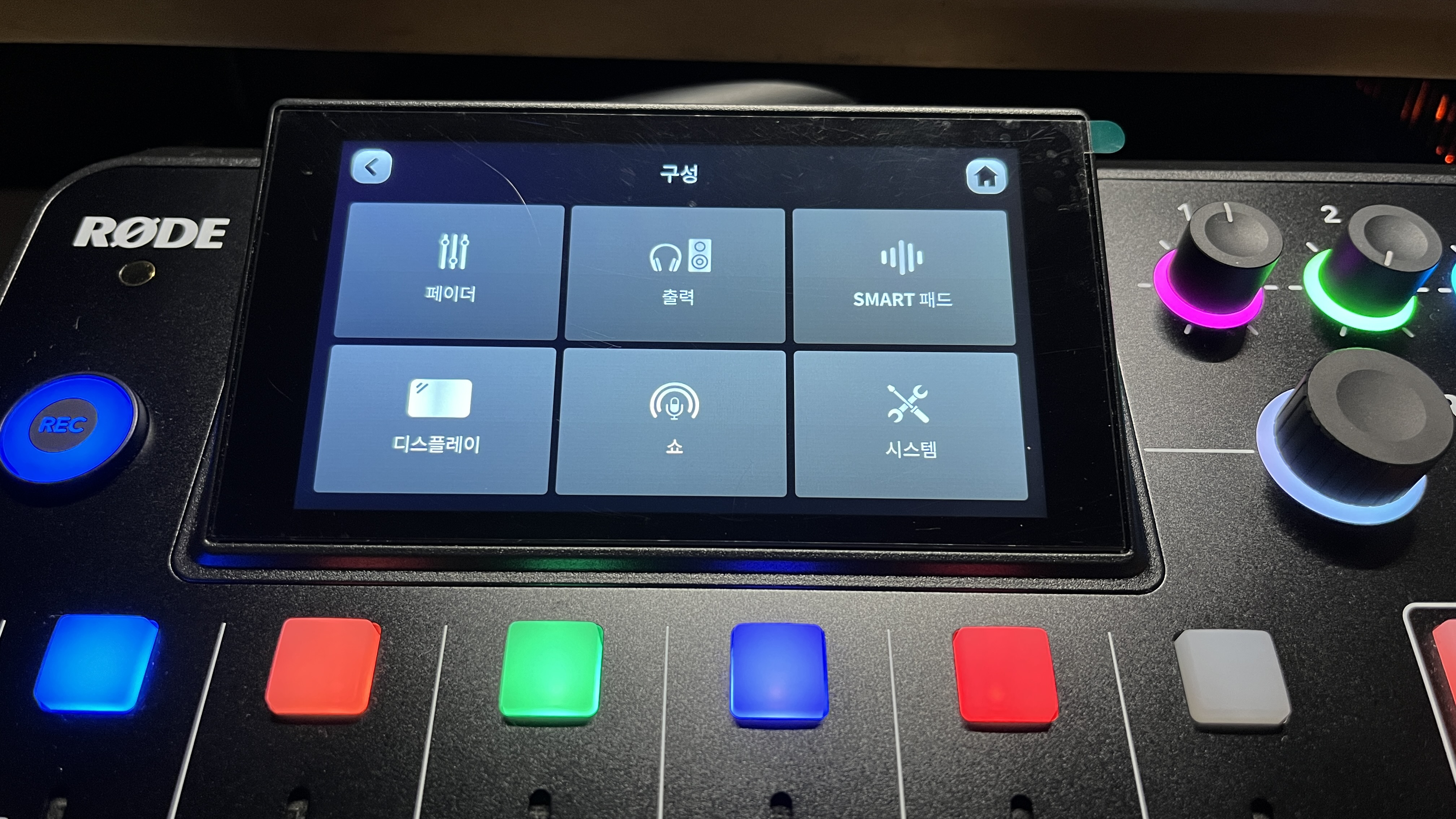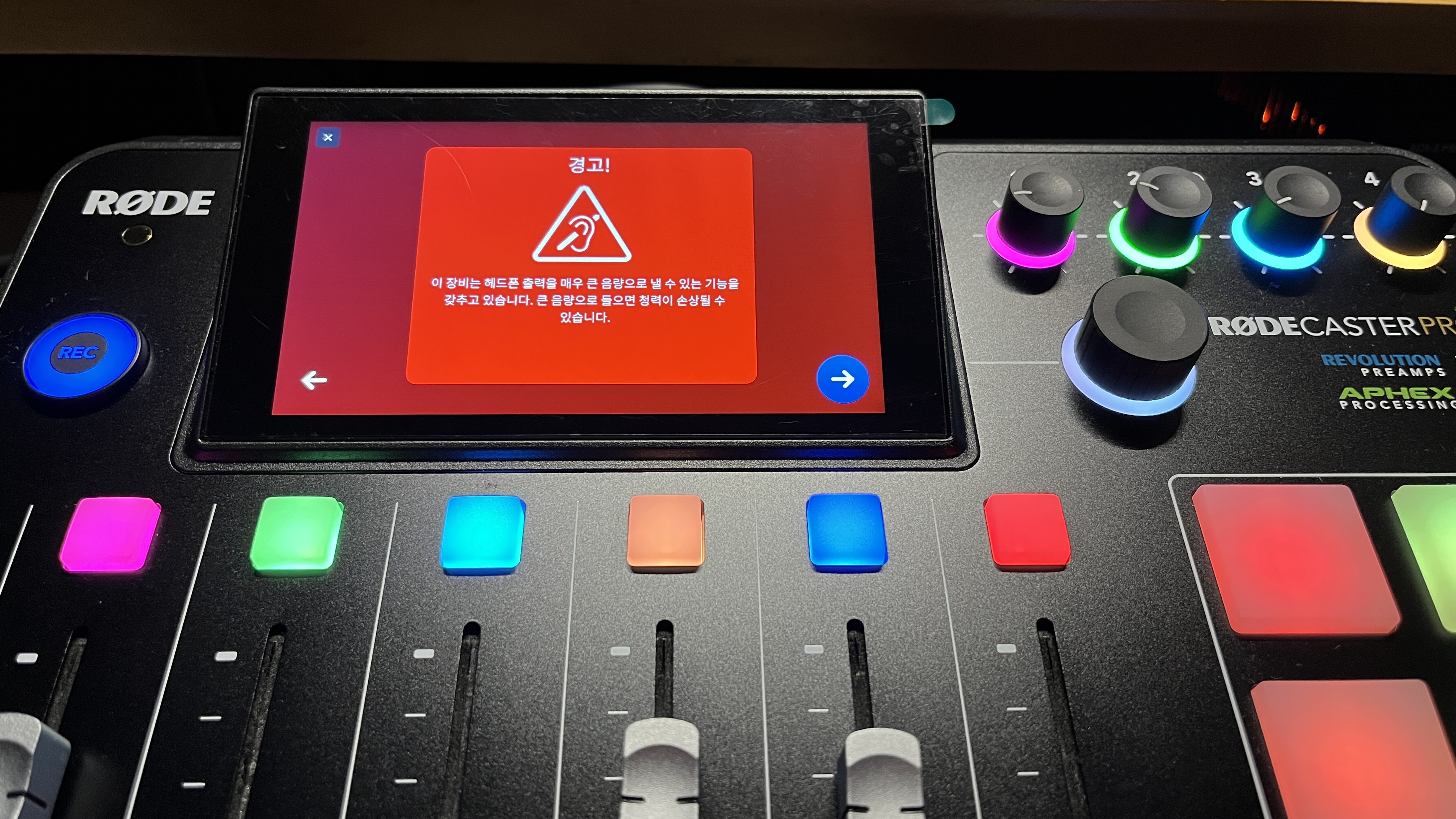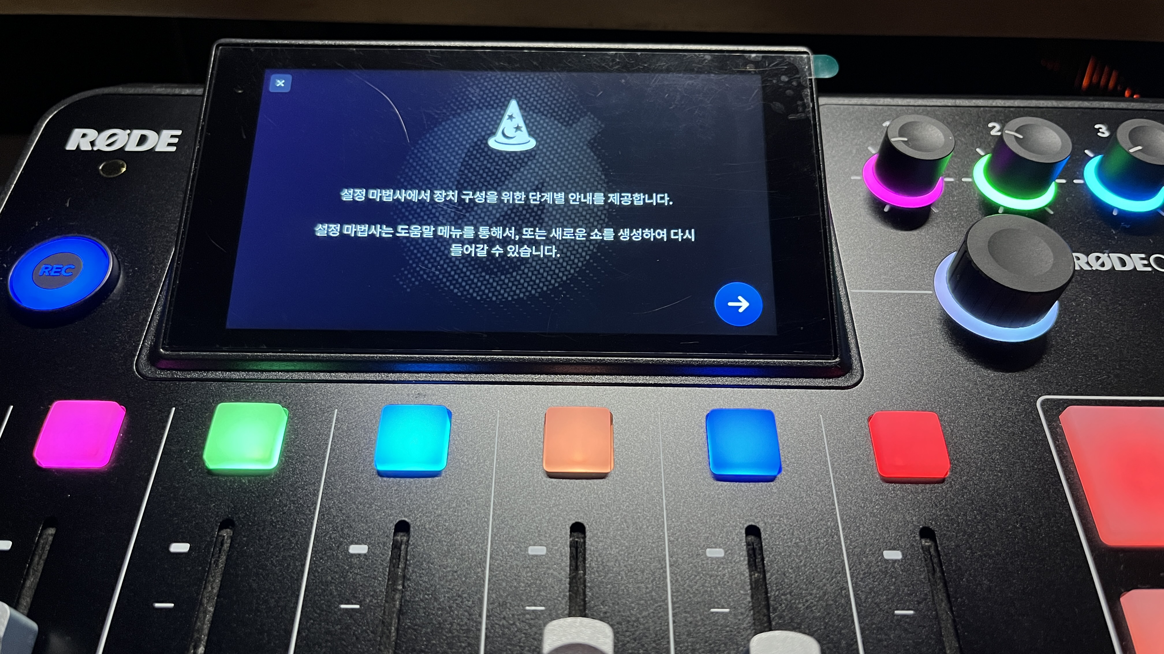 뒷면의 전원 버튼을 가볍게 누르면 약간의 로딩 후 "RøDECaster Pro II"라는 글자가 나오며 초기 세팅이 시작된다. 이미 디지털 믹서를 많이 만져본 사람도 있겠지만, 처음 RøDECaster Pro II로 디지털 믹서를 접하는 사람들도 있기에 이러한 세팅 과정은 중요하다고 생각한다.