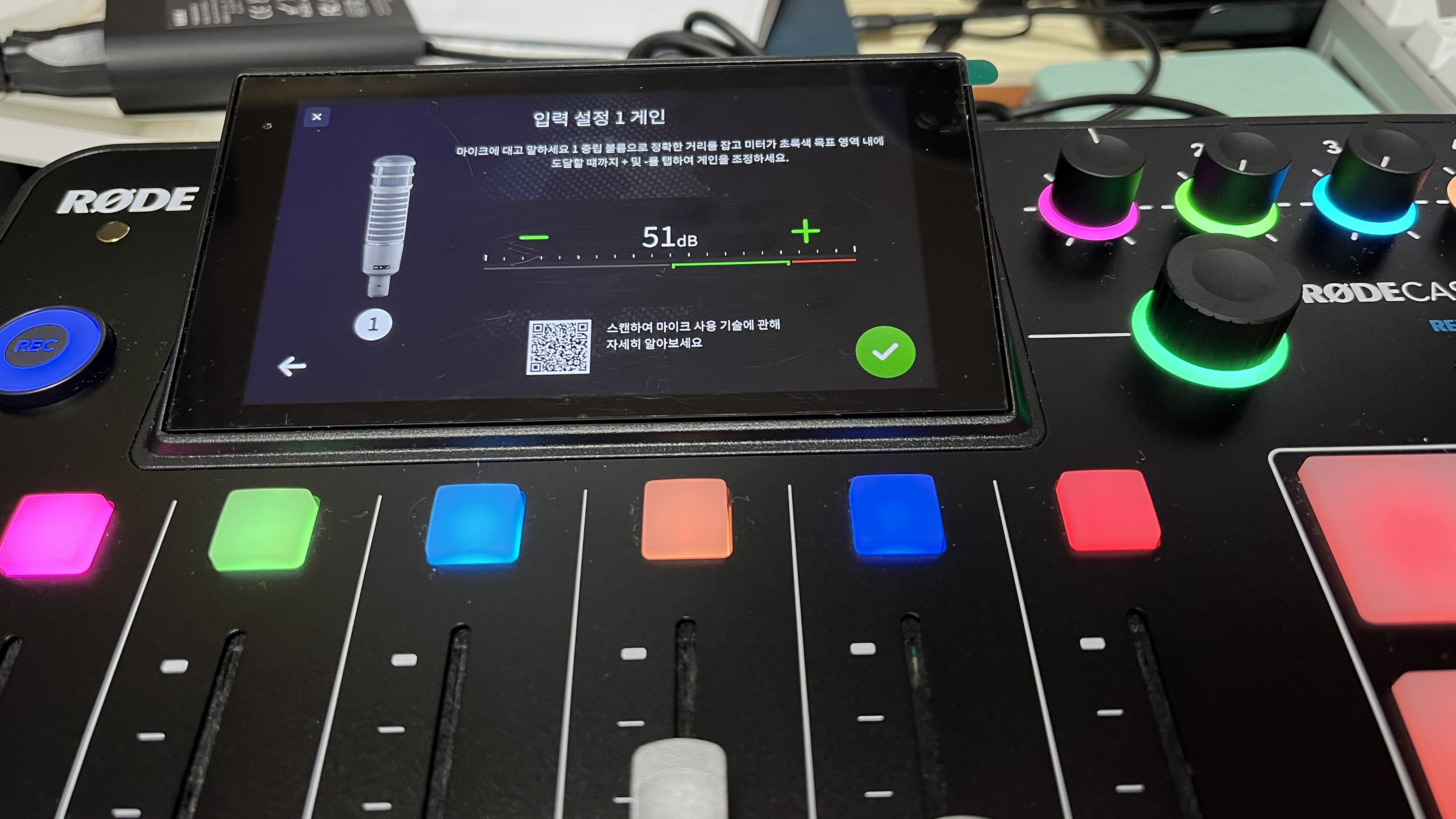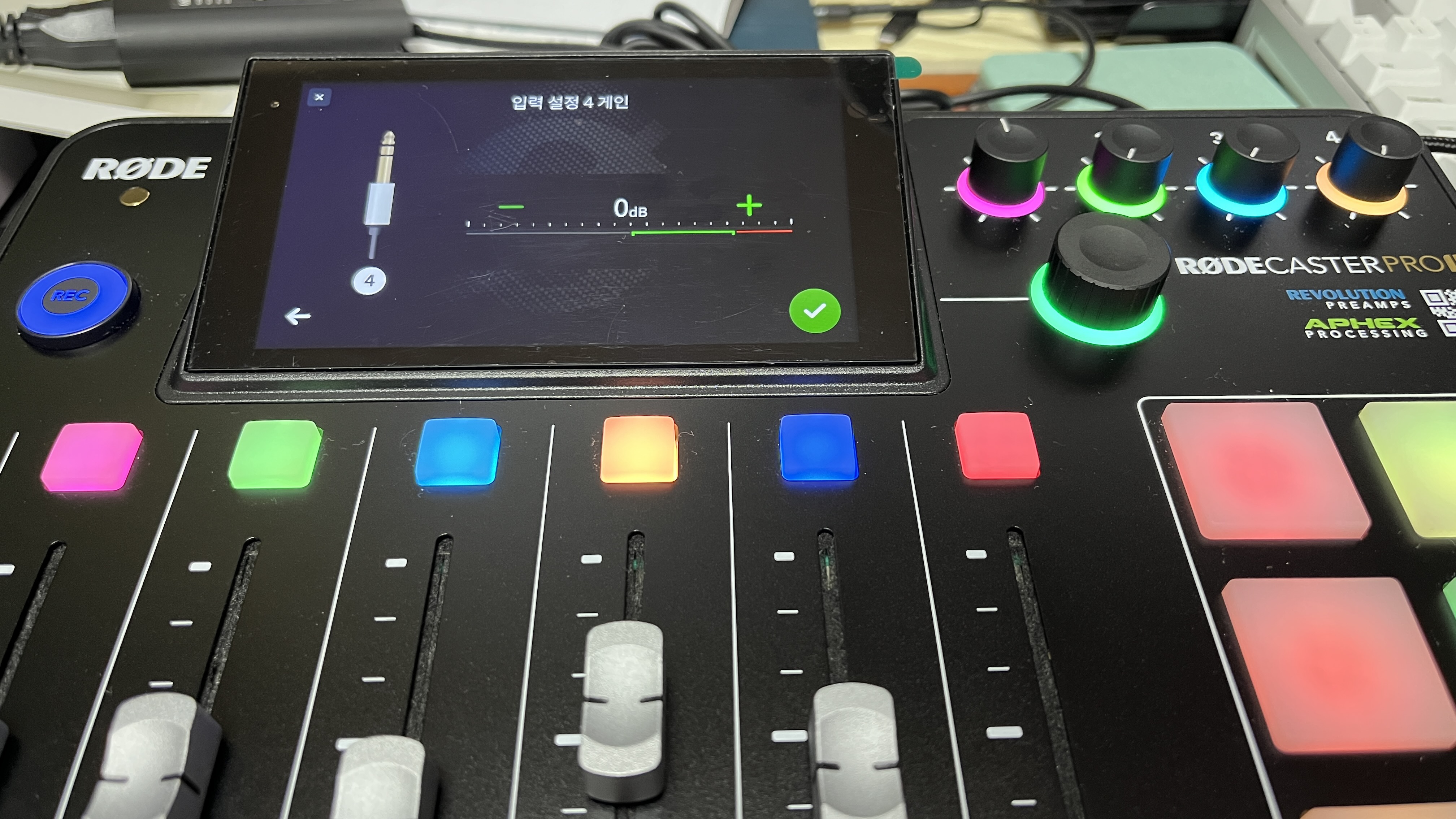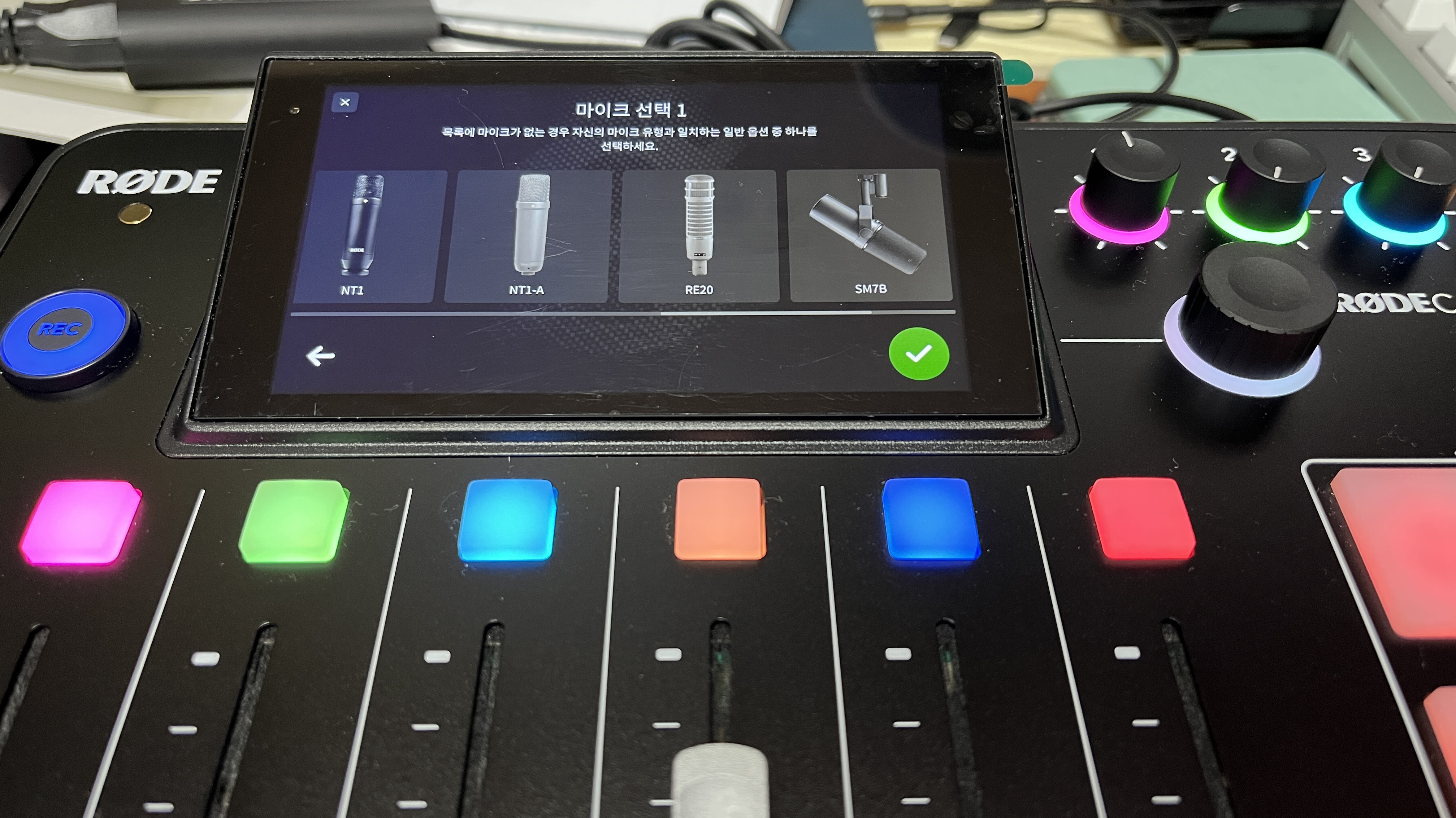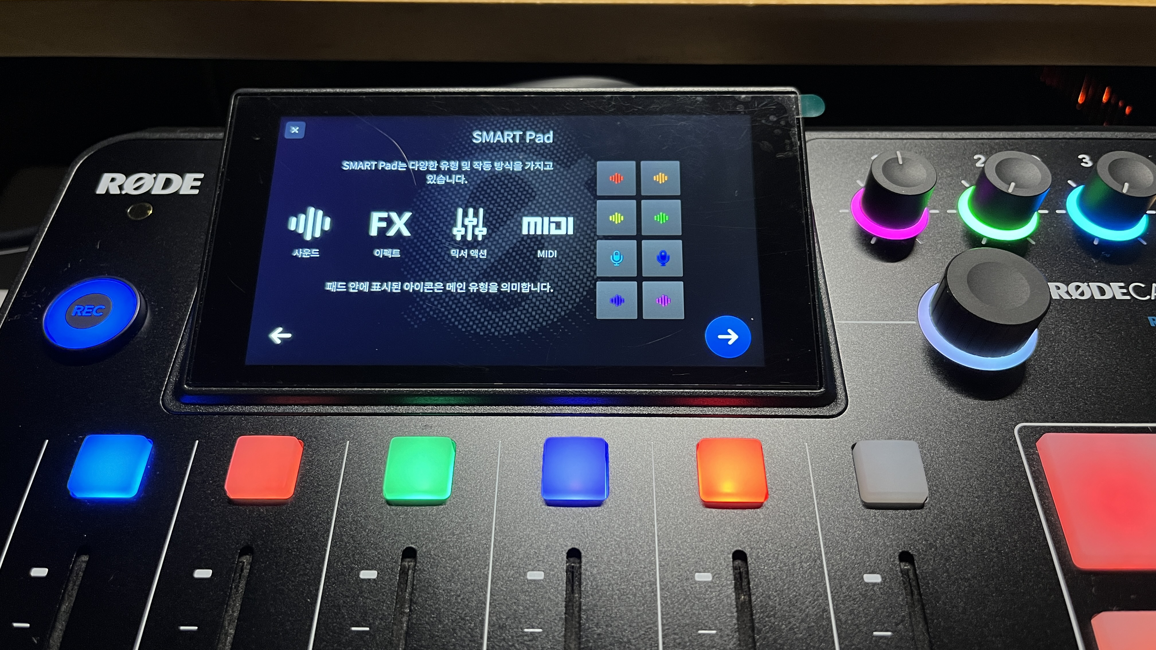 뒷면의 전원 버튼을 가볍게 누르면 약간의 로딩 후 "RøDECaster Pro II"라는 글자가 나오며 초기 세팅이 시작된다. 이미 디지털 믹서를 많이 만져본 사람도 있겠지만, 처음 RøDECaster Pro II로 디지털 믹서를 접하는 사람들도 있기에 이러한 세팅 과정은 중요하다고 생각한다.