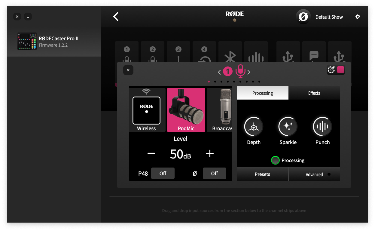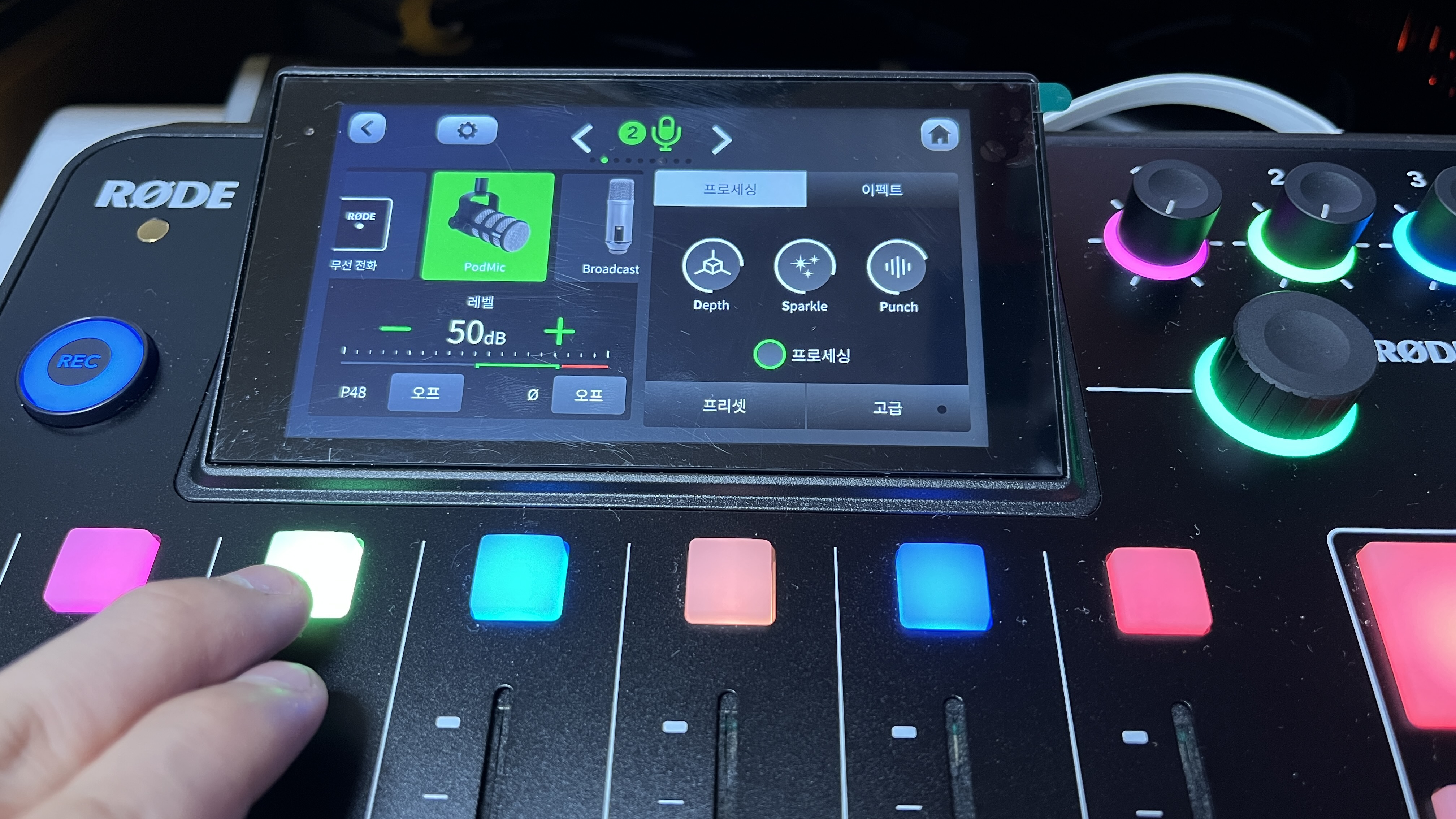 채널 하단의 아이콘을 누르거나 사진처럼 채널 위의 버튼을 누른다면 채널 설정으로 들어가게 된다. 위의 Quick Setup에서 본 마이크 종류 설정과 마이크 레벨값, 그리고 프로세싱 여부를 선택할 수 있다. 프로세싱의 경우 Aphex 사에서 개발한 이펙터들을 사용하는데, Depth, Sparkle, Punch라 불리는 간략화된 이펙터가 기본값이다. 이름 그대로 목소리에 깊이, 반짝임, 그리고 펀치감을 줄 수 있어서 붙인 명칭으로 보인다. 만일 자신이 만든 세팅을 다른 채널에도 적용하고 싶다면 우측 하단의 "프리셋" 버튼을 눌러 프리셋으로 만들 수 있다.