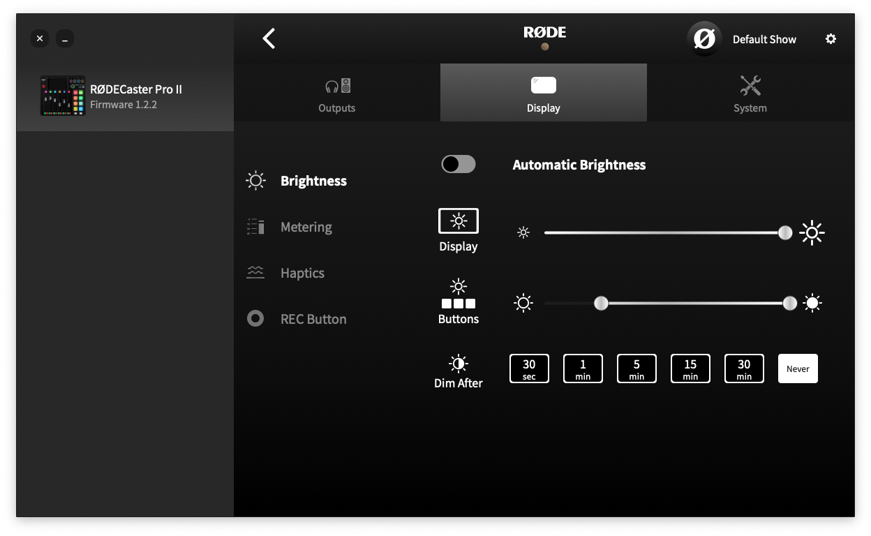 장비 설정 화면에서는 RøDECaster Pro II의 내부 설정들을 조작할 수 있다. 위에서 살펴봤던 헤드폰 출력, 모니터, 라우팅, 리슨, 멀티트랙, 마스터 프로세싱뿐만 아니라 화면 설정 및 시스템 설정을 마우스로 조작할 수 있다.