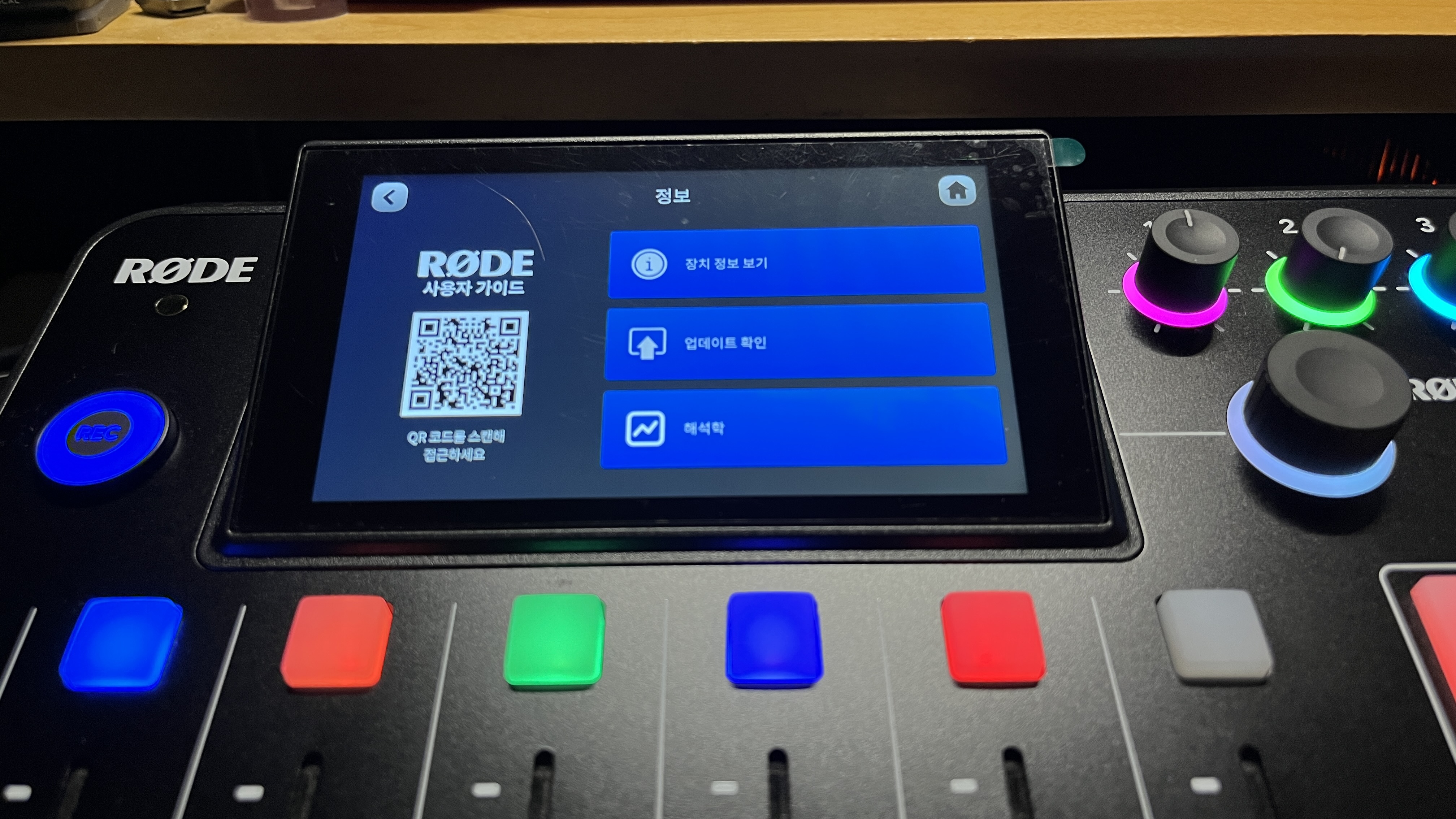 정보 항목에서는 RøDECaster Pro II 장치 정보나 업데이트 확인, 그리고 "해석학"으로 번역된 장비 분석 세팅을 할 수 있다. 좌측의 QR 코드는 제품 매뉴얼로 연결되는 코드다. 만일 RøDECaster Pro II를 사용하다가 모르는 부분이 있다면 QR로 제품 매뉴얼을 확인해 보자.