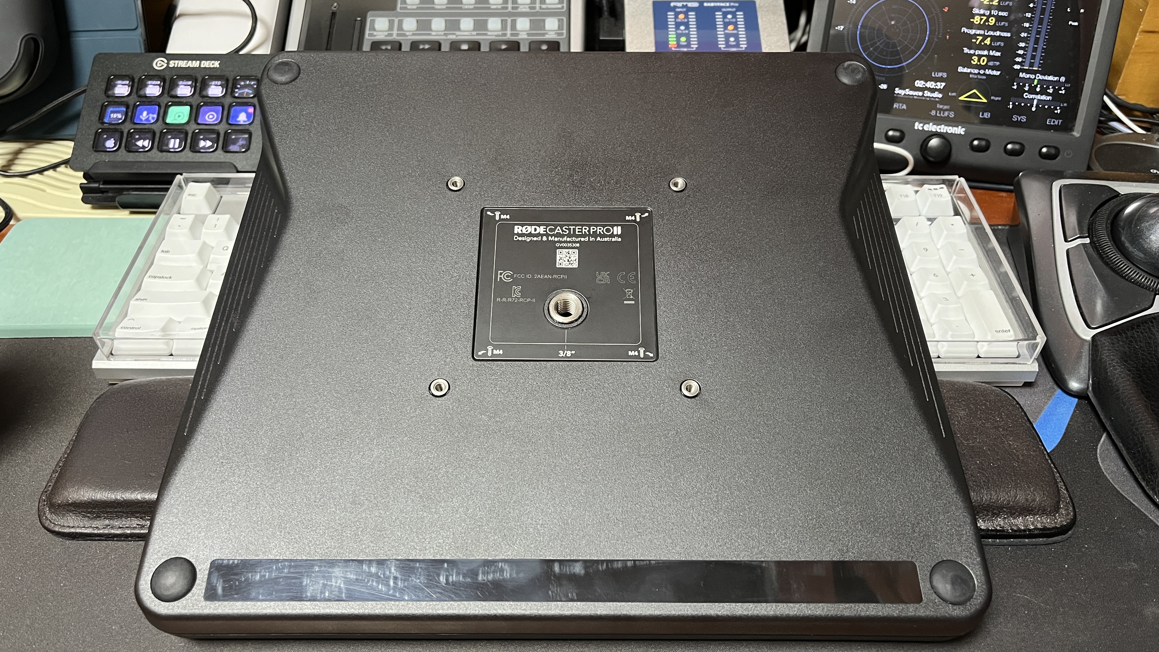 바닥에는 놀랍게도 VESA 마운트 구멍과 마이크 스탠드에 연결할 수 있는 나사 구멍이 위치해 있다. 그냥 책상 위에 올려놓고 작업할 것을 상정한 고무발도 인상적이다. 작은 사이즈의 마이크 스탠드에 RøDECaster Pro II를 연결하거나 바퀴가 달린 스텐드에 RøDECaster Pro II를 연결한다면 더욱 다양한 장소에서 활용할 수 있어 보인다.