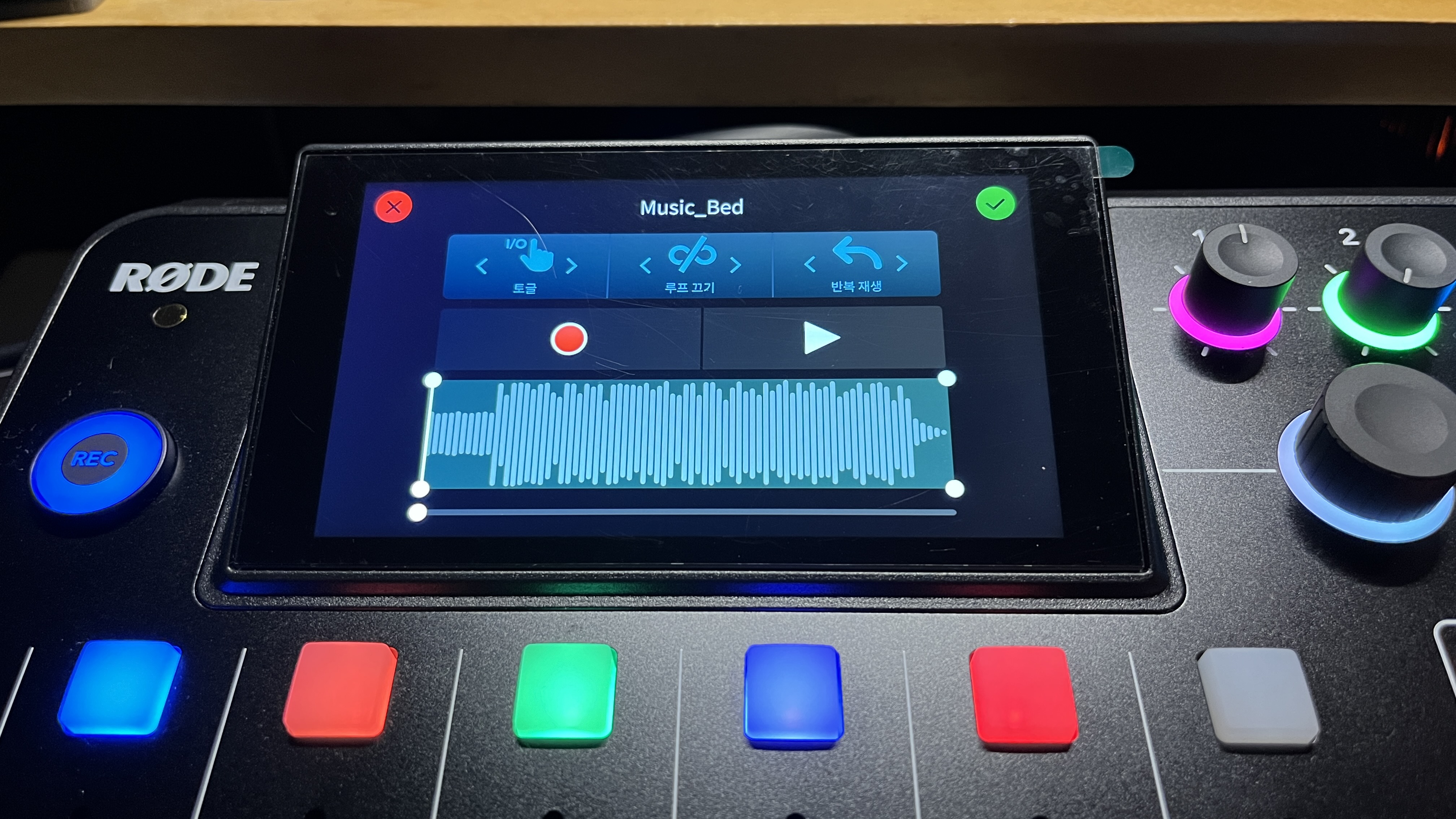 편집 아이콘을 클릭했다면 다음과 같은 화면이 나타난다. 샘플을 토글로 재생할 것인지, 혹은 루프로 재생할 것인지, 샘플 재생이 끝나면 반복해서 재생하게 할 것인지의 옵션이 위에 있고, 바로 아래에는 마이크를 이용한 샘플 레코딩, 미리 듣기 버튼이 있다. 밑에는 샘플의 오디오 길이를 편집할 수 있는데 터치나 우측의 큰 노브를 이용해 조절할 수 있다. 크게 터치로 구간을 잡고 큰 노브로 디테일하게 수정하는 걸 권장한다.
