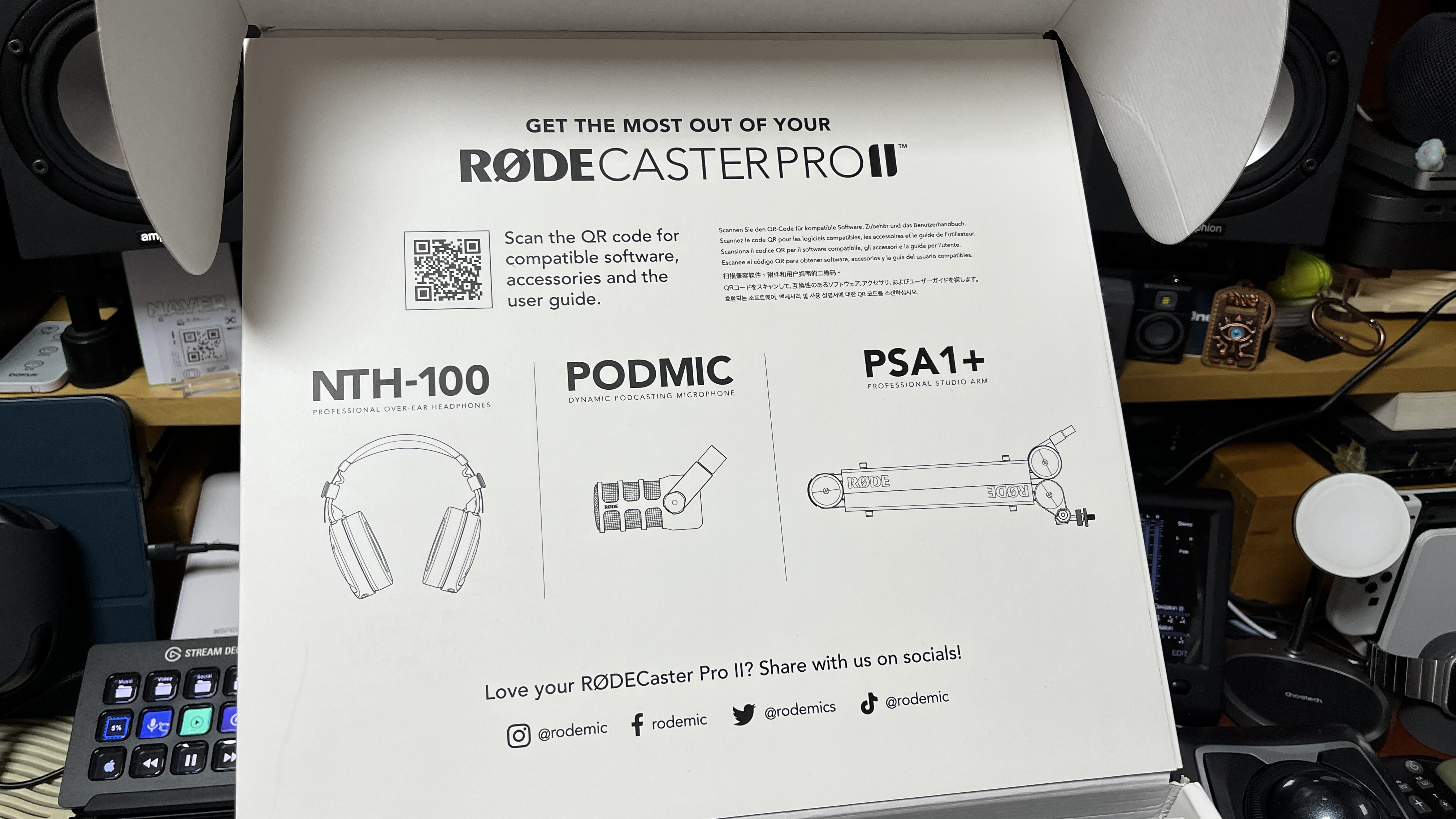 박스를 열자 가장 먼저 필자를 맞이해 준 건 RøDE에서 만든 다른 제품들을 홍보하는 앞광고? 였다. RøDECaster Pro II와 같이 쓰면 좋을 것 같은 제품들만 쏙쏙 넣어놓았다. 이들 중 마이크 암인 PSA1+는 최근 필자가 매우 관심을 가지고 있는 마이크 암이기에 기회가 된다면 한번 리뷰를 해볼까 한다.