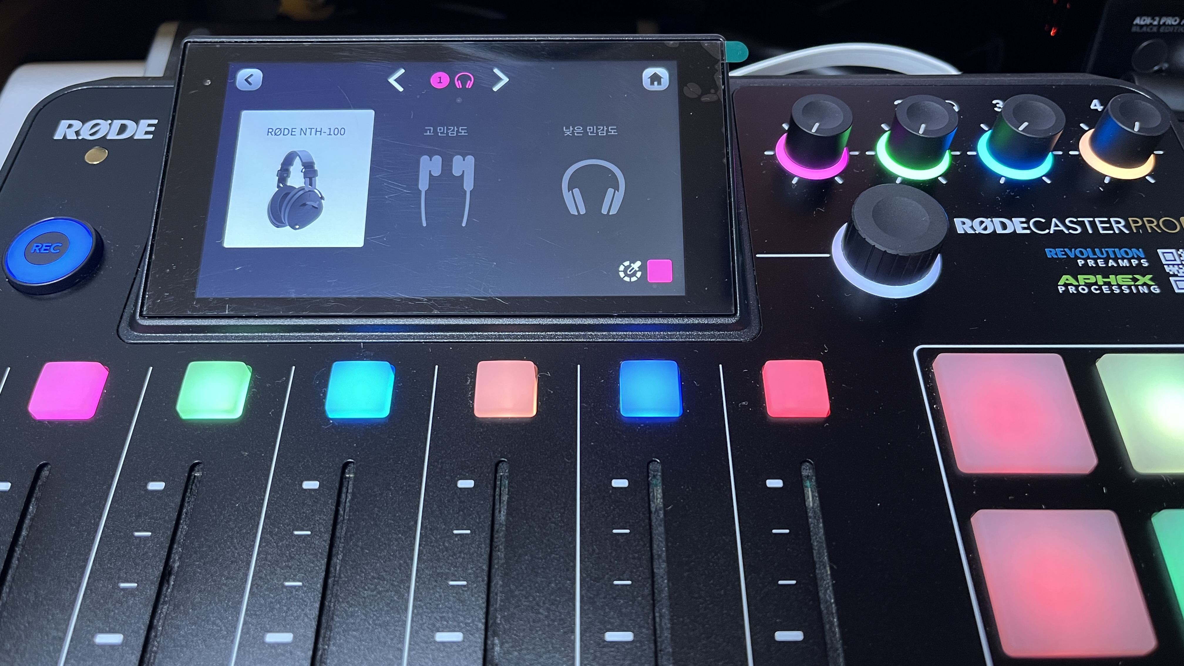 헤드폰 메뉴에서는 지금 믹서에 연결되어 있는 헤드폰에 따라 적합한 설정을 할 수 있다. 이어폰을 믹서에 연결했다면 "고 민감도"를, 헤드폰을 믹서에 연결했다면 "저 민감도"로 설정하면 얼추 맞다. 만일 RøDE에서 출시한 헤드폰을 가지고 있다면, 전용 프리셋이 있으므로 그쪽을 선택하자.
