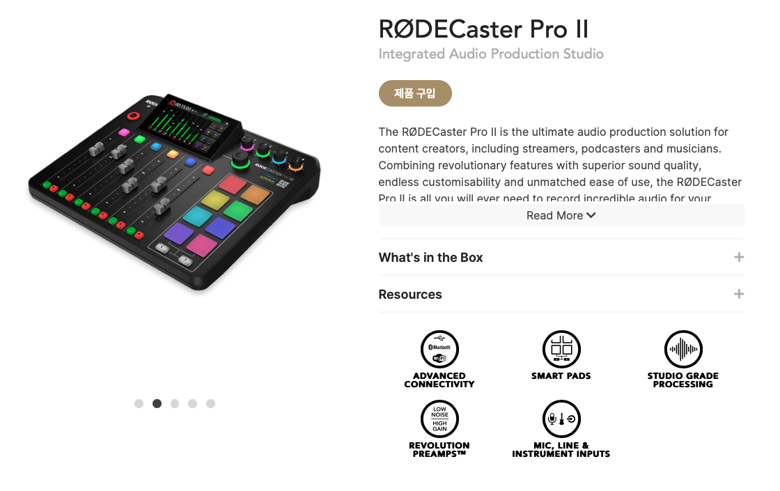 RøDECaster Pro II는 Rode에서 개인 방송 및 팟캐스트 시장을 노려 출시한 디지털 믹서다. 4년 전 1세대인 RøDECaster Pro가 시장에서 흥행한 이후 출시된 후속작이다. RøDECaster Pro는 "개인 방송을 진행하는 사람을 위한 올인원 장비"라는 컨셉을 가지고 있어 개인 방송에서 필요한 모든 기능들이 들어가 있다고 한다. 아쉽게도 필자는 이전 모델을 사용해보지 못했지만 늦게나마 후속 모델을 사용할 수 있어 다행이다. RøDECaster Pro II는 RøDECaster Pro에서 아쉬운 점을 보완한 모델이라 보면 될 듯하다. 모든 노브 및 패드에 컬러 LED가 들어갔고, 조작을 위한 터치스크린의 사이즈가 커지고 내장 이펙터들의 퀄리티 상승, 다양한 입력 지원 등 꽤 다양한 것들이 바뀌었다. 가격은 1,090,000원이다. 가격이 꽤 비싼 것 같지만 인터넷 방송에서 자주 사용되는 인터페이스의 가격이 120만 원 정도인 걸 생각하면 저렴한 축이라 필자는 생각한다. 뭐니 뭐니 해도 RøDECaster Pro II는 단독으로 사용할 수 있는 디지털 믹서다.