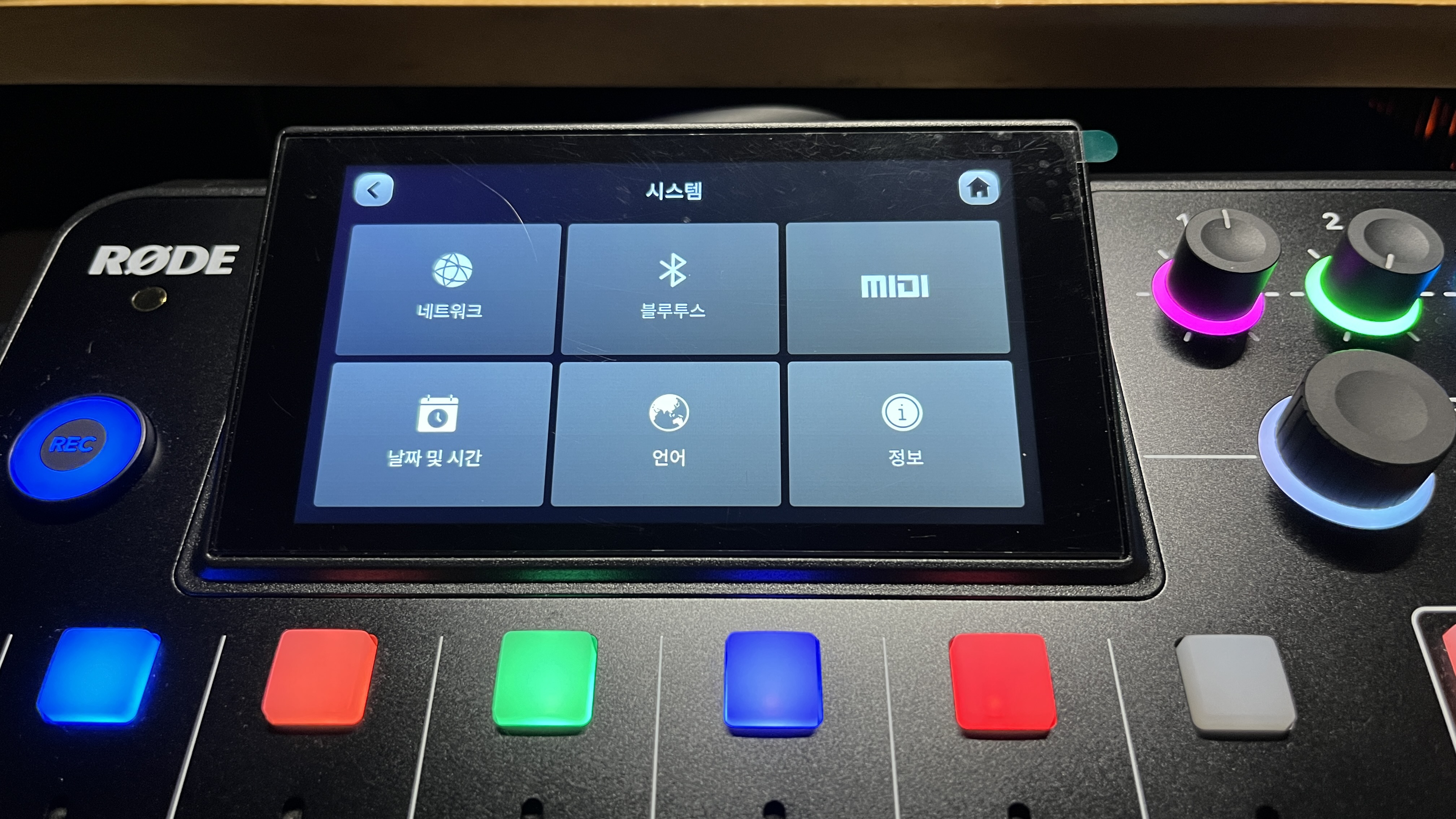 시스템 항목에서는 크게 6개로 나뉜다. 네트워크와 블루투스, MIDI, 날짜 및 시간, 언어, 제품 정보들을 확인하고 수정할 수 있다. MIDI를 제외한 나머지 항목들은 RøDECaster Pro II를 처음 세팅할 때 조절했던 부분들이기에 MIDI와 제품 정보들을 중점으로 설명하도록 하겠다.