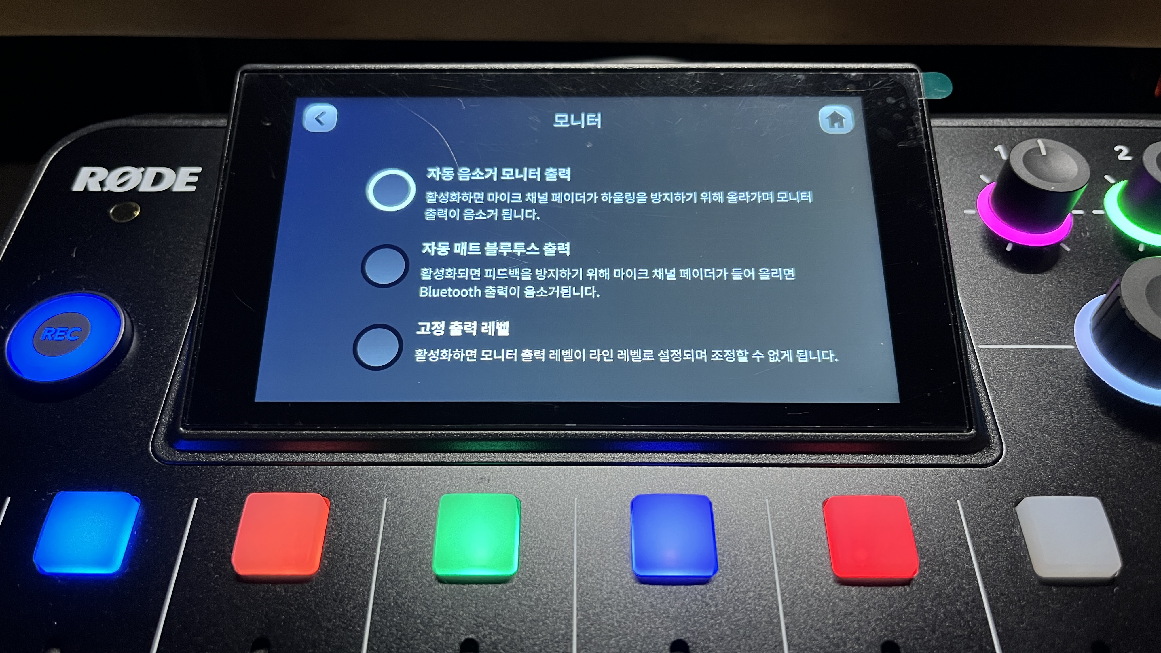 모니터 관련 설정은 헤드폰 출력이 아닌 스피커로 나가는 출력을 이야기한다. 스피커에 연결해서 모니터 하는 특성 덕분에 대부분 피드백을 방지하기 위한 옵션들이 들어 있다. "자동 음소거 모니터 출력"이 기본적이지만 블루투스 출력 정도를 조절할 수 있고, 상황에 따라 모니터 출력을 조절할 수 없게 고정하는 옵션도 있다. 자신이 어떤 환경에서 레코딩할 것인지를 미리 생각한 후 설정하면 좋은 옵션이다.