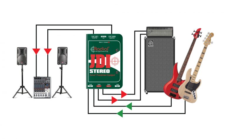 Radial JDI의 상단에는 Radial JDI로 들어오는 입력을 밸런스 아웃으로 뽑아주는 XLR 단자가 있다. L-R 구분이 되어 있지만 상황에 따라 각각 모노로도 활용할 수 있다. 가운데에 있는 Ground / Lift 버튼은 접지로 인한 노이즈를 제거해 주는 역할은 한다. 건물마다 전기 배선이 다른 경우가 있는데, 이때 Ground / Lift 버튼을 눌러 접지 노이즈를 제거할 수 있다. 이는 건물마다 사정이 다르기 때문에 노이즈가 들리지 않는 방향으로 설정하면 된다. 꼭 이렇게 해야 한다 같은 정답이 있는 게 아니다.