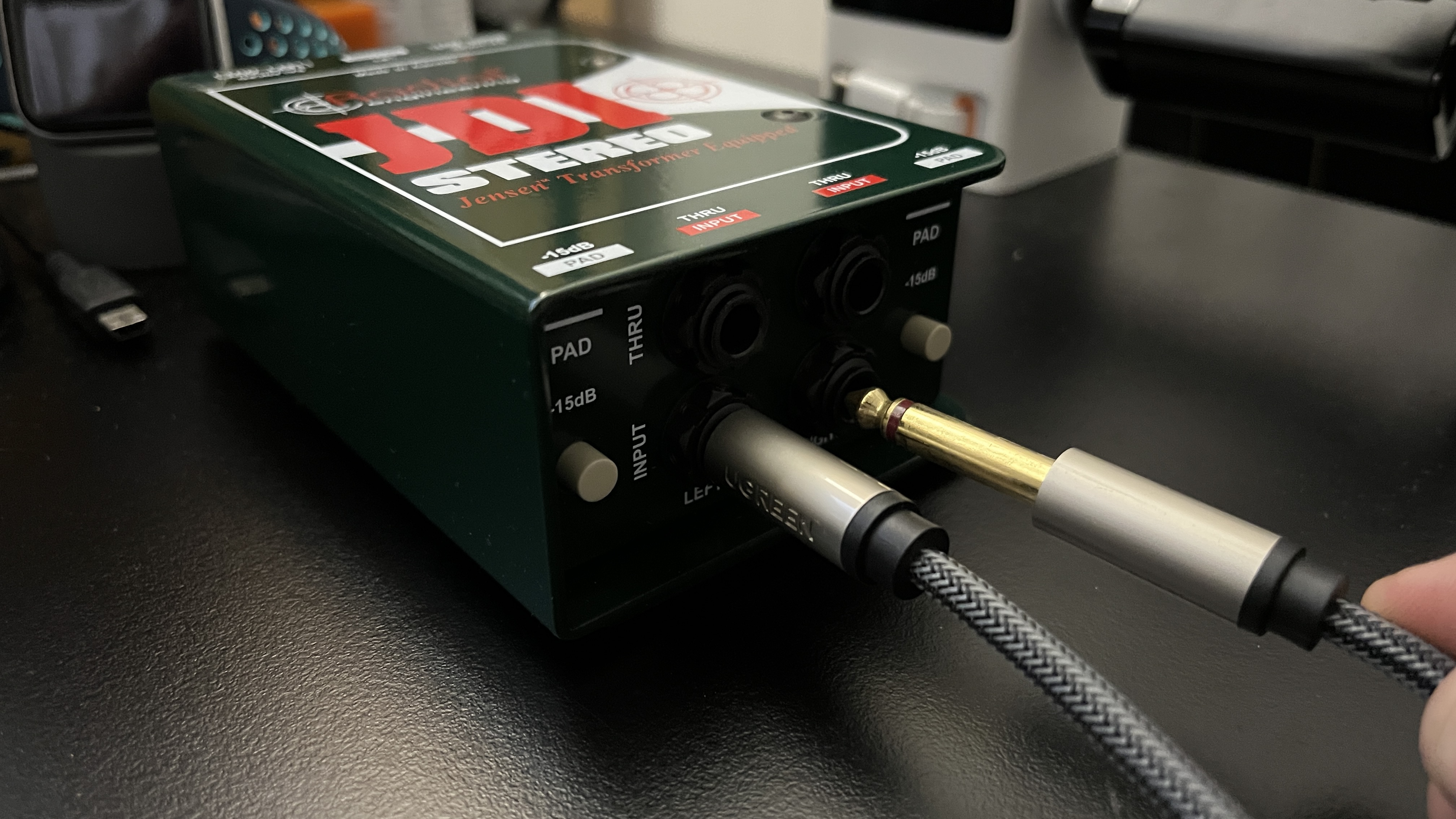 그렇다면 Radial JDI Stereo DI-Box를 한번 설정해 보자. 마침 필자에게는 최근 구매한 EP-133 드럼머신이 있다. EP-133은 스테레오 아웃을 지원하지만, 3.5파이를 이용하여 출력하는 형태기 때문에 언밸런스드 규격이다. 이 상태로 오디오 인터페이스에 직결해서 사용할 수도 있지만, 노이즈에 취약하다는 단점이 있다. 그렇기에 DI-Box에 연결하게 된다면 전기 노이즈 혹은 외부 노이즈를 DI-Box에서 걸러주기 때문에 이전보다 훨씬 깔끔하게 녹음할 수 있다는 장점이 있다.