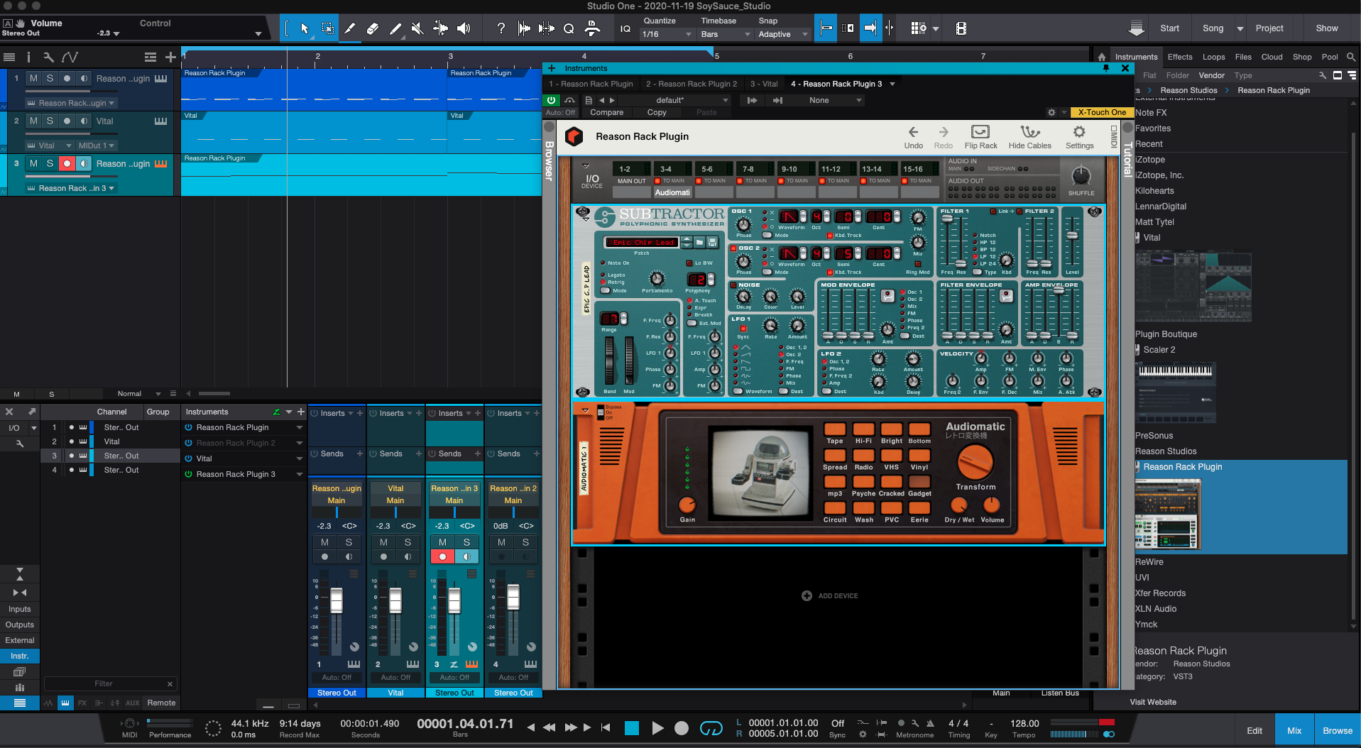 각설하고, Reason의 내장 플러그인들의 퀄리티는 매우 훌륭하다. Korg 드럼 머신, 맥시마이저, 스테레오 이미저 등 내장되어 있는 각각의 악기나 이펙터들은 과거에 어딘가의 스튜디오의 랙장에 꽂혀 있는 녀석을 그대로 디지털로 구현한 듯하다. Reason은 자신들이 개발한 고유한 이펙터나 악기들을 어딘가 진짜 하드웨어가 있는 것처럼 정교하게 만들어내는 것에 능력이 있는 듯하다. Reason을 사용하면서 필자가 가장 마음에 들었던 이펙터는 "Audiomatic Retro Transformer", "MClass Maximizer"다. 스튜디오 원의 내장 이펙터들 역시 좋기로 정평이 났지만, Reason의 이펙터들은 정말 유료 이펙터를 사용하는 것 같은 느낌을 받았기 때문이다. 스튜디오 원에서 따로 빼서 쓰고 싶을 정도로 매우 마음에 든 이펙터들이다.