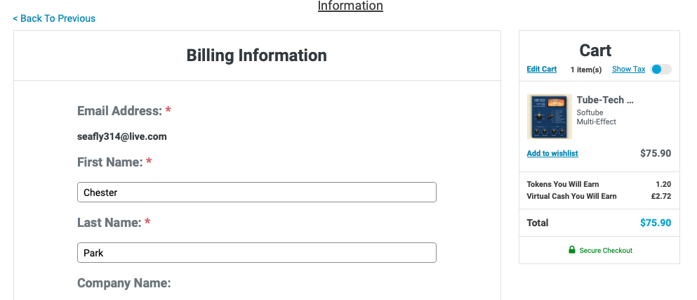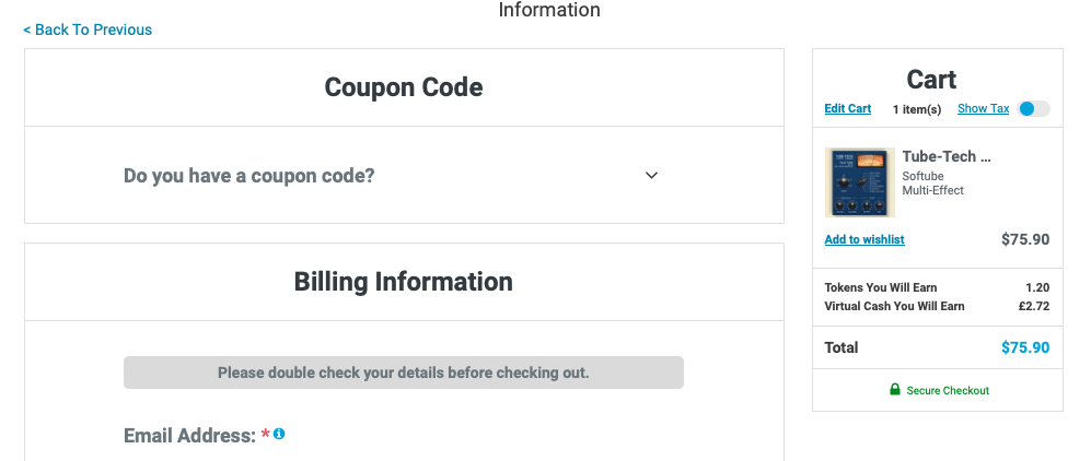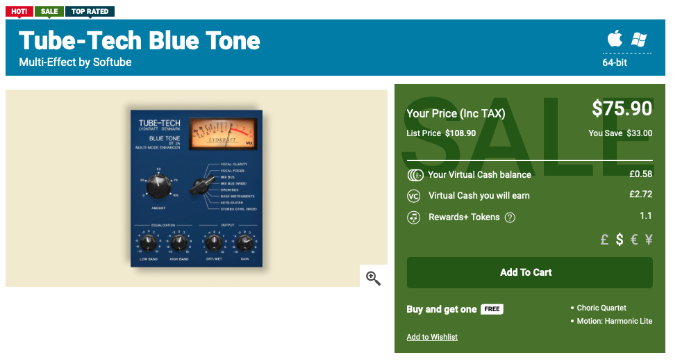 Softube Tube-Tech Blue Tone 구매 링크 (PluginBoutique)를 클릭하거나, Plugin Boutique(링크)에 접속한 후, 검색창에 "Softube Tube-Tech Blue Tone"를 검색하면 위와 같은 화면이 나타난다. Plugin Boutique는 회원 가입을 하지 않아도 상품 구매가 가능하지만, 회원 가입을 하는 편이 추후 라이센스 관리에 용이하다. 기본값은 파운드화로 나타나지만 달러나 엔, 유로화로 가격을 바꿔가며 확인할 수 있다. 다만, 대한민국 원은 지원하지 않으므로 해외 결제가 지원되는 카드나 페이팔 계정을 미리 준비할 필요가 있다. Add to Cart를 클릭하여 상품을 내 장바구니로 담자.