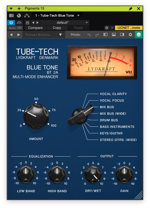 중간에는 Tube-Tech Blue Tone이 어느 정도 걸릴지 조절할 수 있는 amount 노브와 함께 Tube-Tech의 컬러를 악기별로 미리 정해놓은 프리셋 선택 노브가 있다. 베이스나 드럼, 보컬, 스테레오 기타 등 다양한 장르에서 사용할 수 있다는 점이 꽤 마음에 든다.