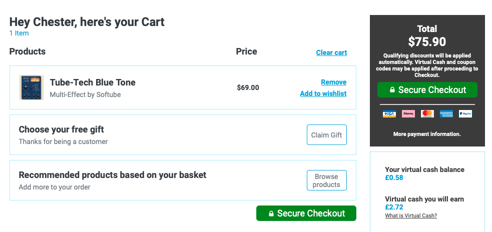 홈페이지 상단 우측에 자리 잡은 Cart를 누르면 다음과 같은 화면이 나타난다. 이 화면에서는 이번 구매로 적립되는 캐시, 구매로 적립되는 토큰을 확인할 수 있으며 상품 구매로 받을 수 있는 무료 선물을 선택할 수 있다. 만일 Plugin Boutique에서 처음 구매한다면 Claim Gift를 클릭해서 무료 선물을 받아가는 게 좋다. 플러그인 하나만 샀을 뿐인데 공짜로 다른 플러그인들도 가져갈 수 있다. 무료로 받을 수 있는 플러그인들은 기간에 따라 다르니 미리 구매 전에 어떤 걸 무료로 주는지 체크해 보는 것도 좋다. 모든 작업이 완료되었다면 초록색 "Secure Checkout"을 눌러 다음 화면으로 넘어가자.