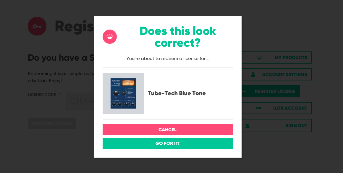 알맞은 라이센스를 넣게 된다면 사진과 같이 "이 라이센스를 등록하려는 것이 맞냐"라는 메시지가 나타난다. Softube Tube-Tech Blue Tone이 맞게 표시되었다면 추가를 누르자. 만일 다른 사진이 나왔다면 키를 잘못 받았거나, 다른 키를 등록한 거다.