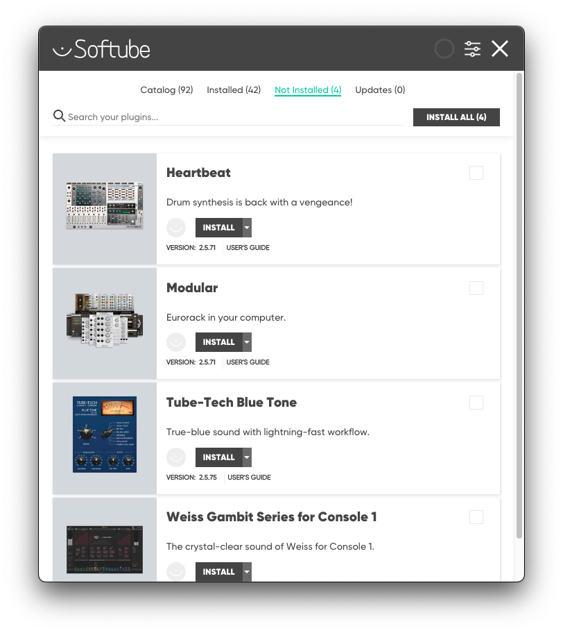라이센스 등록이 완료되었다면 마지막으로 플러그인 설치다. Softube의 플러그인들은 Softube Central이라는 허브 프로그램에서 일괄적으로 설치 및 업데이트를 할 수 있다. Softube Central을 설치한 후 들어간 다음, 새로 추가된 Softube Tube-Tech Blue Tone을 설치하면 모든 작업이 끝난다.