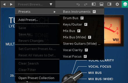 Tube-Tech Blue Tone에도 프리셋이 있다. 그런데 사실 프리셋이 의미가 없을 정도로 간단하게 만들어져 있어서 참고만 하면 좋을 듯 하다. 물론 자신만의 세팅을 따로 프리셋 화해서 저장해 놓을 수도 있다. Softube의 전매특허 중 하나인 Preset Collection도 사용할 수 있다.