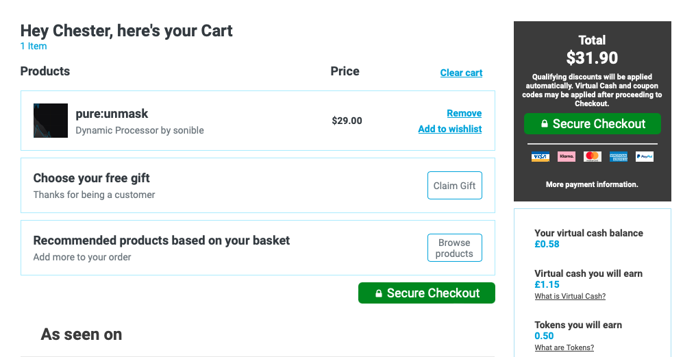 홈페이지 상단 우측에 자리 잡은 Cart를 누르면 다음과 같은 화면이 나타난다. 이 화면에서는 이번 구매로 적립되는 캐시, 구매로 적립되는 토큰을 확인할 수 있으며 상품 구매로 받을 수 있는 무료 선물을 선택할 수 있다. 만일 Plugin Boutique에서 처음 구매한다면 상단의 이미지처럼 Claim Gift를 클릭해서 무료 선물을 받아가는 게 좋다. 플러그인 하나만 샀을 뿐인데 공짜로 다른 플러그인들도 가져갈 수 있다. 무료로 받을 수 있는 플러그인들은 기간에 따라 다르니 미리 구매 전에 어떤 걸 무료로 주는지 체크해 보는 것도 좋다. 모든 작업이 완료되었다면 초록색 "Secure Checkout"을 눌러 다음 화면으로 넘어가자.