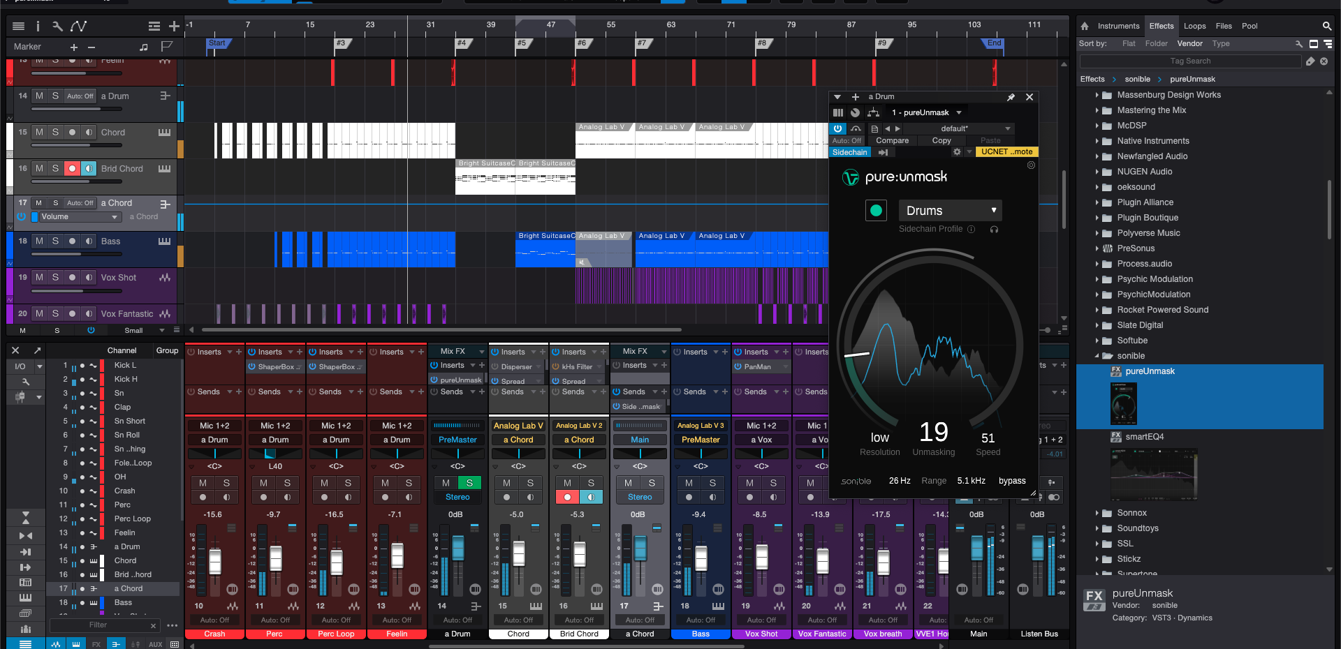 제품 인증 및 설치까지 마무리한 후 DAW를 확인해 보면 이펙터 리스트에 pure:unmask가 표시되고 있다. AU, VST2, VST3을 지원하고 있어 어떠한 DAW에서도 사용할 수 있다. 필자가 자주 사용하는 Studio One은 세 가지의 모든 플러그인 규격을 지원하고 있어 사용하기 편리하다. 다만 가독성을 위해 VST3 규격의 플러그인을 제외하곤 전부 숨김 처리한 뒤 사용하고 있다.