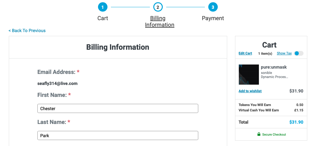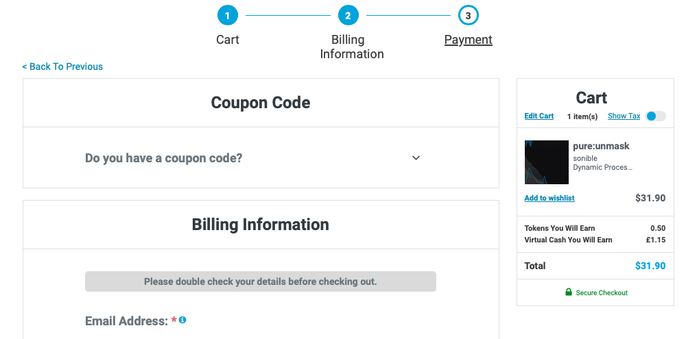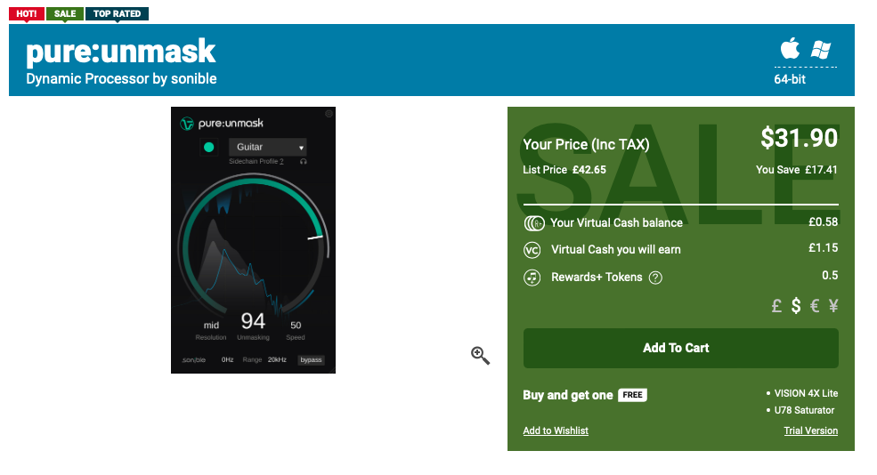 Sonible pure:unmask 구매 링크 (PluginBoutique)를 클릭하거나, Plugin Boutique(링크)에 접속한 후, 검색창에 "pure:unmask"를 검색하면 위와 같은 화면이 나타난다. Plugin Boutique는 회원 가입을 하지 않아도 상품 구매가 가능하지만, 회원 가입을 하는 편이 추후 라이센스 관리에 용이하다. 기본값은 파운드화로 나타나지만 달러나 엔, 유로화로 가격을 바꿔가며 확인할 수 있다. 다만, 대한민국 원은 지원하지 않으므로 해외 결제가 지원되는 카드나 페이팔 계정을 미리 준비할 필요가 있다. Add to Cart를 클릭하여 상품을 내 장바구니로 담자.