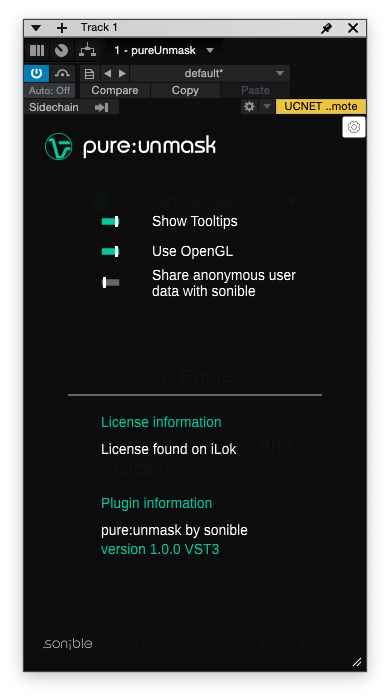 Smart 시리즈와 달리, Sonible pure:unmask 관련 설정은 크게 만질 게 없다. 팁 설정, OpenGL 사용 여부, 위에서 미리 살펴봤던 사용 데이터를 Sonible에 전송할 수 있는 옵션을 제외하고는 뭐가 없다. 라이센스가 정상적으로 iLok에 인식되었는지, 현재 pure:unmask의 버전을 확인하는 창을 제외하면 자주 보진 않을 듯 하다. 이런 것들이 있구나 정도만 파악하고 넘어가면 된다.