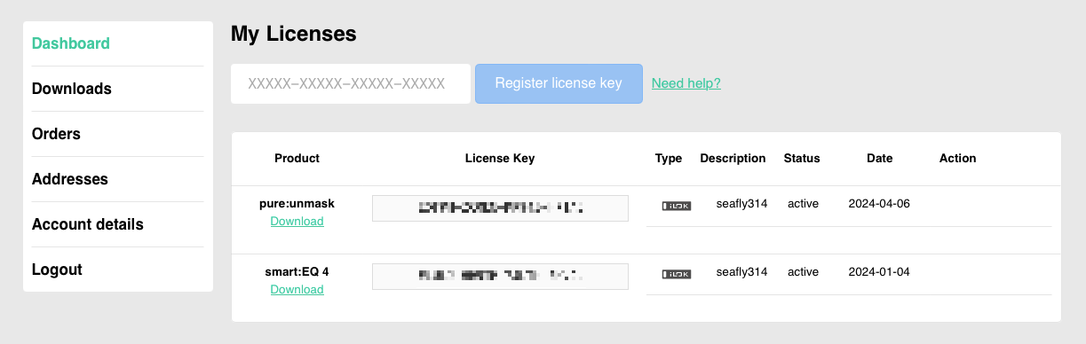 다음은 Sonible 공식 홈페이지에서의 작업이 필요하다. Sonible 플러그인을 사용하기 위해서는 2가지가 필요하다. 하나는 제품 등록을 위한 Sonible 계정, 그리고 라이센스 관리를 위한 iLok 계정이 필요하다. 필자는 예전에 Soible 플러그인을 사용했었기에 계정이 있었다. 계정을 만든 후 My Page로 들어오면 다음과 같은 화면을 마주하게 된다. 딱 봐도 어디에 시리얼 번호를 넣어야 하는지 보이지 않는가? PluginBoutique에서 발급받은 시리얼 키를 넣고 Register license key 버튼을 누르자.