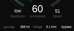 그런데 위의 값들을 적절히 사용하고 있음에도 불구하고 원하는 대역이 계속 깎여나간다는 느낌을 받는 경우가 있을 수 있다. 그럴 때에는 하단에 있는 주파수 값들을 주목하자. 왠지 작은 주파수와 큰 주파수가 있지 않은가? 바로 그거다. pure:unmask가 작용하는 주파수 범위를 설정할 수 있다. 예를 들어 킥의 트랜지언트가 깎이는 것이 싫다면 킥의 트랜지언트가 발생하는 주파수 대역을 제외해주기만 하면 된다. 매우 사용이 간편하다.