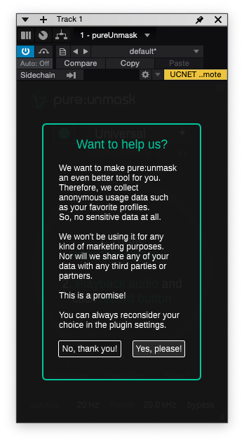 Sonible pure:unmask를 처음 실행하게 되면 다음과 같은 화면이 나타나면서 이펙터를 사용할 때 데이터를 Sonible 측에 공유할지를 물어보는 선택지가 나타난다. 여기서 OK를 눌러 데이터 공유를 해도 되고, 하지 않아도 무방하다. 이 옵션은 추후 설정에서 철회하거나 선택할 수 있다.