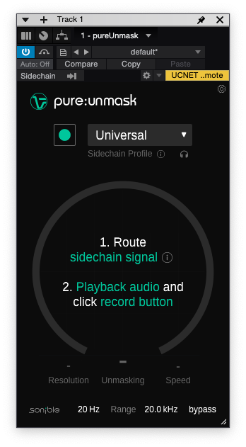 Sonible pure:unmask를 처음으로 실행하면 다음과 같은 화면이 반겨준다. pure:unmask의 사용 방법은 굉장히 단순하다. 마스킹이 일어나는 트랙 중에 중요도가 떨어지는 트랙에 pure:unmask을 걸어주고, 돋보여야 하는 채널로 사이드체인을 걸어준다. 이후 음악을 틀은 후, record 버튼을 눌러서 사이드체인으로 들어오는 값을 인식한 후 사용하면 된다. 설명만 들으면 정말 간단한 사용 방법이 아닐 수 없다. 그런데 여기서 필자는 하루를 날려먹었다. 일단 첫번째로 사이드체인을 거는 게 DAW마다 제각각이고, 저기서 말하는 "Record Button"이 DAW의 버튼인지, 아니면 pure:unmask에 내장되어 있는 버튼인지 알 길이 없었기 때문이다. 만일 필자처럼 헷갈려하는 분이 있다면 꼭 보길 바란다. 프리셋 옆에 있는 초록색 버튼, 저게 "Record Button"이다.
