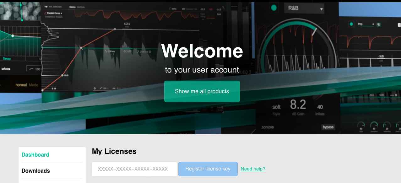 다음은 Sonible 공식 홈페이지에서의 작업이 필요하다. Sonible 플러그인을 사용하기 위해서는 2가지가 필요하다. 하나는 제품 등록을 위한 Sonible 계정, 그리고 라이센스 관리를 위한 iLok 계정이 필요하다. 필자는 예전에 Soible 플러그인을 사용했었기에 계정이 있었다. 계정을 만든 후 My Page로 들어오면 다음과 같은 화면을 마주하게 된다. 딱 봐도 어디에 시리얼 번호를 넣어야 하는지 보이지 않는가? PluginBoutique에서 발급받은 시리얼 키를 넣고 Register license key 버튼을 누르자.