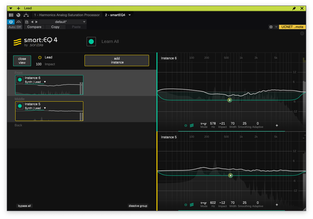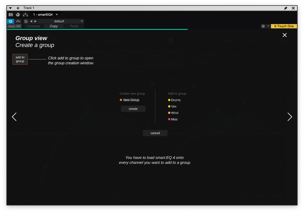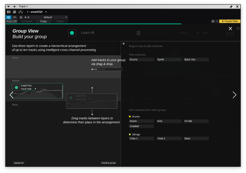각각의 smart:EQ 4의 값들은 인스턴스로 분류된다. 인스턴스를 어떻게 배치할지는 이제 사용자에게 달렸다. 같은 그룹에 없는 인스턴스더라도 상단의 "add instance" 버튼을 눌러서 추가할 수 있다. 따로 이름을 먹이지 않는다면 instance XXX의 형태로 나오므로 Group 기능을 자주 사용할 일이 있다면 번거롭더라도 인스턴스의 이름을 미리 정해줘야 한다.