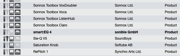Sonible은 최근 음악 제작자들 사이에서 가장 핫한 회사다. 인공지능 및 딥러닝을 가장 적극적으로 활용해서 음악 작업에 도입하면 더욱 빠르게 작업할 수 있는 AI 기반 플러그인들을 주로 개발하고 있다. 주요 시리즈로는 AI 기술을 전면에 내세운 smart 시리즈, One-Knob 스타일로 빠르게 결과를 얻을 수 있는 pure 시리즈, 그리고 정확한 오디오 분석에 초점을 맞춘 true 시리즈가 있다. 이 밖에도 sonible은 하드웨어도 만드는데, MADI 컨버터나 멀티 채널 앰프, 다채널 스피커 등 특이한 제품군이 많다. 하드웨어와 소프트웨어 둘 다 기술력을 가지고 있는 숨은 강자인 셈이다.