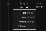 우측 상단 근처에 Analyzer 관련 설정이 있어 필요에 따라 On/Off가 가능하다. 생각보다 다양한 옵션을 가지고 있어 필자의 입맛대로 설정할 수 있었다. EQ가 걸리지 않은 파형부터 틸팅 보정 등 다양하다.