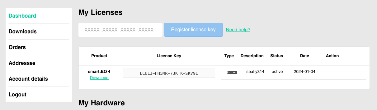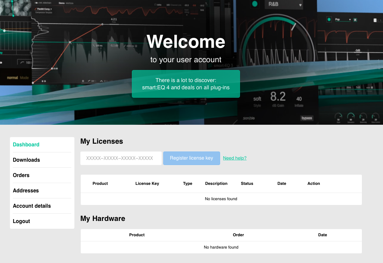 다음은 Sonible 공식 홈페이지에서의 작업이 필요하다. Sonible 플러그인을 사용하기 위해서는 2가지가 필요하다. 하나는 제품 등록을 위한 Sonible 계정, 그리고 라이센스 관리를 위한 iLok 계정이 필요하다. 필자는 예전에 Soible 플러그인을 사용했었기에 계정이 있었다. 계정을 만든 후 My Page로 들어오면 다음과 같은 화면을 마주하게 된다. 딱 봐도 어디에 시리얼 번호를 넣어야 하는지 보이지 않는가? PluginBoutique에서 발급받은 시리얼 키를 넣고 Register license key 버튼을 누르자.