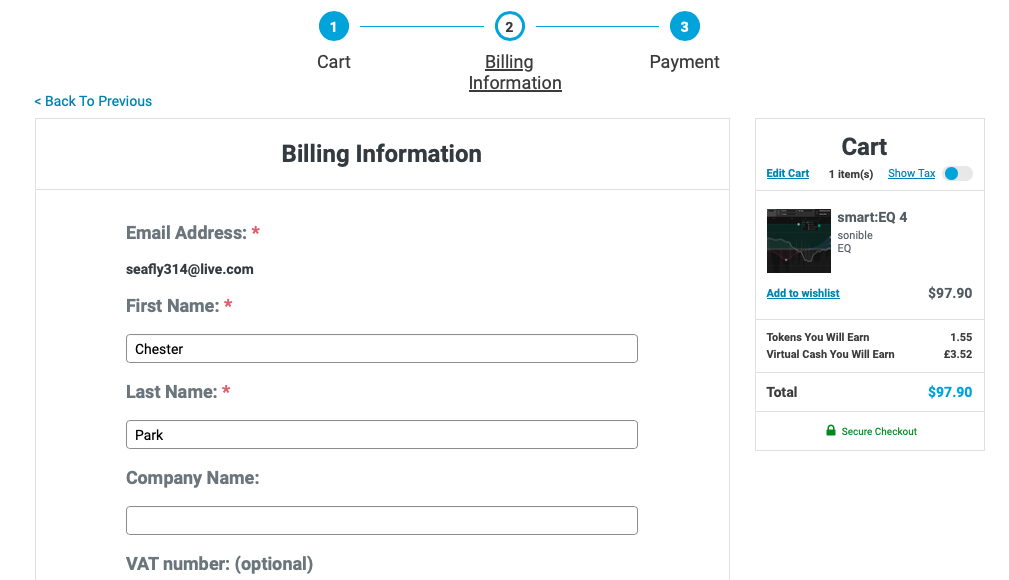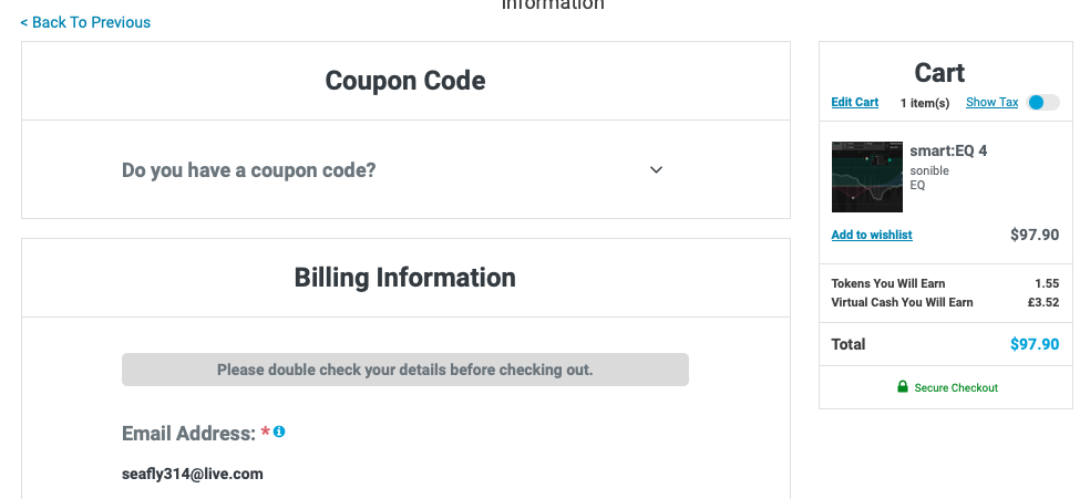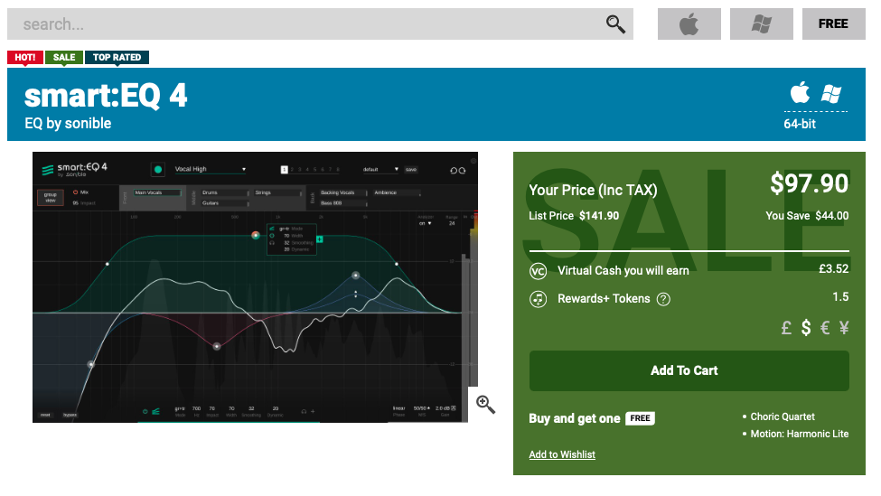 Sonible smart:EQ 4 구매 링크 (PluginBoutique)를 클릭하거나, Plugin Boutique(링크)에 접속한 후, 검색창에 "smart:EQ 4"를 검색하면 위와 같은 화면이 나타난다. Plugin Boutique는 회원 가입을 하지 않아도 상품 구매가 가능하지만, 회원 가입을 하는 편이 추후 라이센스 관리에 용이하다. 기본값은 파운드화로 나타나지만 달러나 엔, 유로화로 가격을 바꿔가며 확인할 수 있다. 다만, 대한민국 원은 지원하지 않으므로 해외 결제가 지원되는 카드나 페이팔 계정을 미리 준비할 필요가 있다. Add to Cart를 클릭하여 상품을 내 장바구니로 담자.