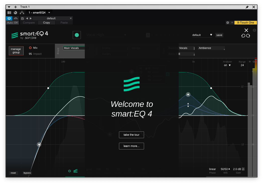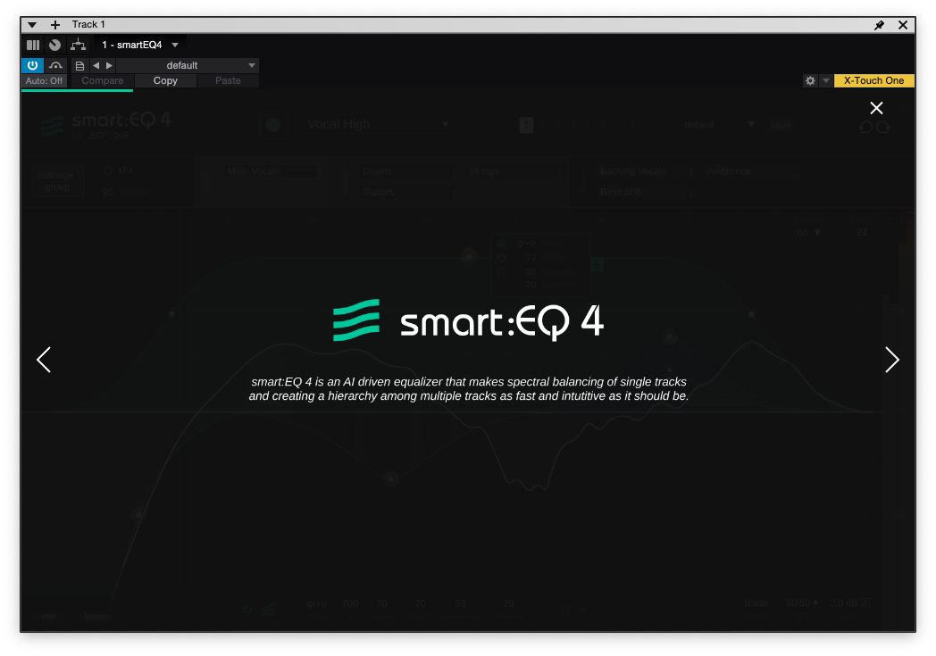 smart:EQ 4는 AI 주도의 이퀄라이저로, 개별 트랙에서 스펙트럼 밸런싱 및 그룹을 만들어 계층적 구조를 이용해 다수의 트랙을 편리하게 제어할 수 있습니다.