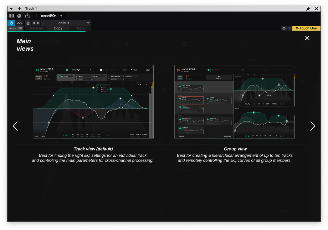 Sonible smart:EQ 4는 두가지 모드가 있다. 하나는 다른 일반적인 EQ에서 볼 수 있는 모습 중 하나인 Track View, 다른 하나는 다양한 트랙에 걸린 EQ를 동시에 제어할 수 있는 Group View다. 각각 장단점이 있기에 상황에 맞춰서 선택하면 된다.