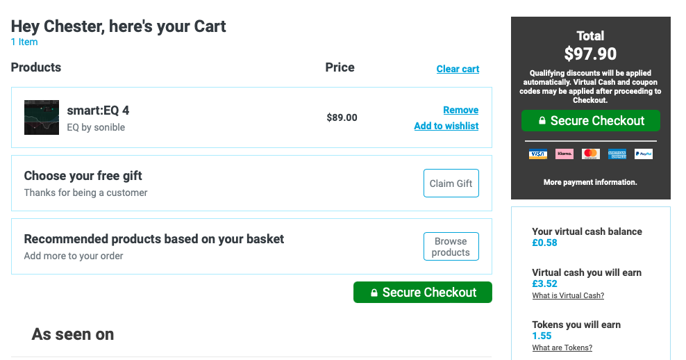 홈페이지 상단 우측에 자리 잡은 Cart를 누르면 다음과 같은 화면이 나타난다. 이 화면에서는 이번 구매로 적립되는 캐시, 구매로 적립되는 토큰을 확인할 수 있으며 상품 구매로 받을 수 있는 무료 선물을 선택할 수 있다. 만일 Plugin Boutique에서 처음 구매한다면 상단의 이미지처럼 Claim Gift를 클릭해서 무료 선물을 받아가는 게 좋다. 플러그인 하나만 샀을 뿐인데 공짜로 다른 플러그인들도 가져갈 수 있다. 무료로 받을 수 있는 플러그인들은 기간에 따라 다르니 미리 구매 전에 어떤 걸 무료로 주는지 체크해 보는 것도 좋다. 모든 작업이 완료되었다면 초록색 "Secure Checkout"을 눌러 다음 화면으로 넘어가자.