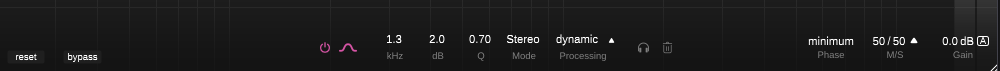 하단에는 세부적인 설정들이 모여 있는데 smart:EQ 4의 밴드 리셋 및 바이패스부터 현재 선택한 밴드에 대해서 값을 디테일하게 조절할 수 있다. 앞서 살펴봤던 간편 기능들을 포함해서 각 밴드별로 부가적인 기능들을 사용할 수 있는데, 일반 EQ로 사용할지, 다이나믹 EQ로 사용할지 선택할 수 있다. 클릭 한 번으로 꽤 간단하게 전환할 수 있어서 놀랐다. 우측에는 리니어 페이즈 모드로 전환할 수 있는 기능과 Mid/Side 정도를 조절할 수 있는 기능이 있어 보다 복잡하게 smart:EQ 4를 운용할 수 있다.