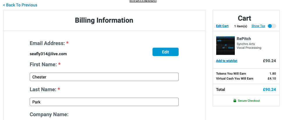RePitch 구매 링크 (PluginBoutique)를 클릭하거나, Plugin Boutique(링크)에 접속한 후, 검색창에 "RePitch"를 검색하면 위와 같은 화면이 나타난다. Plugin Boutique는 회원 가입을 하지 않아도 상품 구매가 가능하지만, 회원 가입을 하는 편이 추후 라이센스 관리에 용이하다. 기본값은 파운드화로 나타나지만 달러나 엔, 유로화로 가격을 바꿔가며 확인할 수 있다. 다만, 대한민국 원은 지원하지 않으므로 해외 결제가 지원되는 카드나 페이팔 계정을 미리 준비할 필요가 있다. Add to Cart를 클릭하여 상품을 내 장바구니로 담자.
