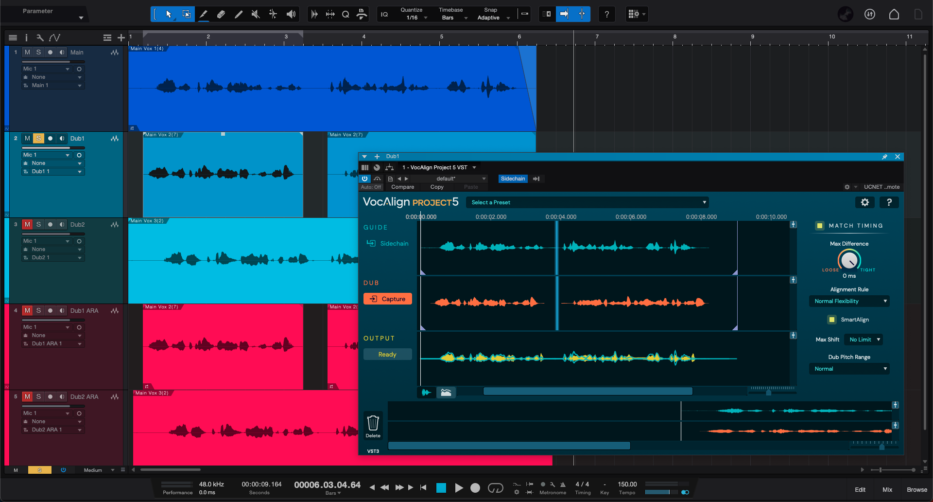 보정을 완료한 VocAlign 5 Project의 모습은 다음과 같다. 먼저 Guide 트랙에는 사이드체인을 통해 들어온 기준이 되는 트랙의 오디오 타이밍 정보가 기록되어 있고, Dub 트랙에는 방금 전 Capture를 진행한 트랙의 오디오 타이밍이 기록되오 있다. 이 상태에서 우측의 "Match Timing"을 켜 주면 자동으로 타이밍을 잡아준다. 참 쉽다!