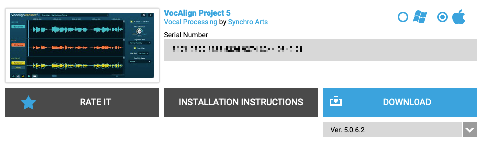 결제가 끝난 후, 상단의 "My Account"를 클릭하면 방금 전에 구매한 VocAlign 5 Project의 시리얼 번호가 표시되어 있다. 여기서 설치 파일 다운로드와 설치 시 주의사항 등을 확인할 수 있다. 만일 시리얼 대신 영문으로 긴 안내문이 표시되어 있다면 아직 전산상으로 시리얼 번호가 발급되지 않았다는 뜻이므로 조금 기다려야 한다.