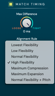 이제 우측의 설정을 확인해보자. Match Timing 아래의 "Max Difference" 노브는 Dub Track이 Guide Track에 어느 정도로 동기화될 것인지를 결정할 수 있다. 완벽하게 동기화되어야 하는 경우엔 우측의 Tight로 설정하면 되지만, 약간의 여유를 두고 싶을 경우에는 노브를 돌려 약간의 여유를 줄 수 있다.