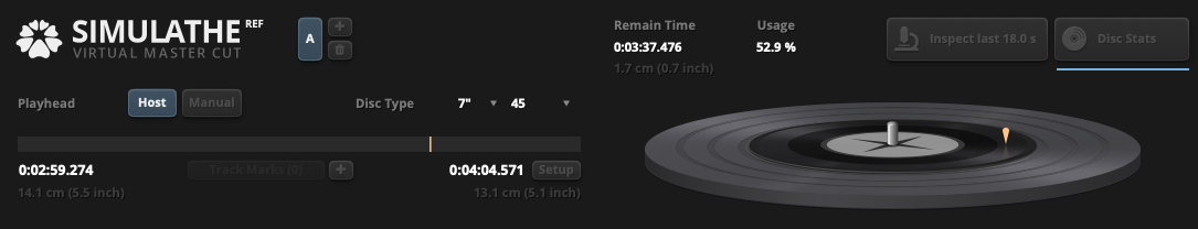 TDR SimuLathe REF의 최상단에는 재생 헤드의 위치 및 디스크 커팅 시 공간 소비 예측을 위한 세팅 메뉴가 있다. 좌측의 Playhead 메뉴에서 "Host" 및 "Manual" 모드 중 선택해서 사용할 수 있다. 또한 디스크 타입 및 회전 속도를 설정할 수 있다. 이 부분을 먼저 설정해야 할 필요가 있는데, Vinyl 디스크 시뮬레이션 기능을 완벽하게 하려면 필수적인 기능이다. 가운데 상단의 시간 및 사용량 표기는 앞으로 레코딩 가능한 음원의 시간과 디스크에 남은 공간을 시뮬레이션한 후 보여준다. 이는 디스크의 크기 및 재생 속도(RPM)에 따라 달라진다. 디스크 사이즈는 7인치부터 12인치까지 고를 수 있고, RPM은 33 1/3 RPM부터 78 RPM까지 설정할 수 있다.