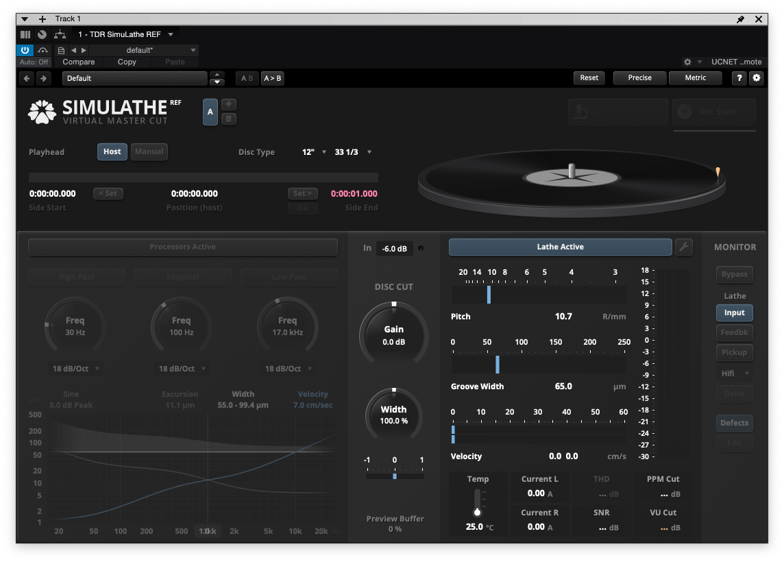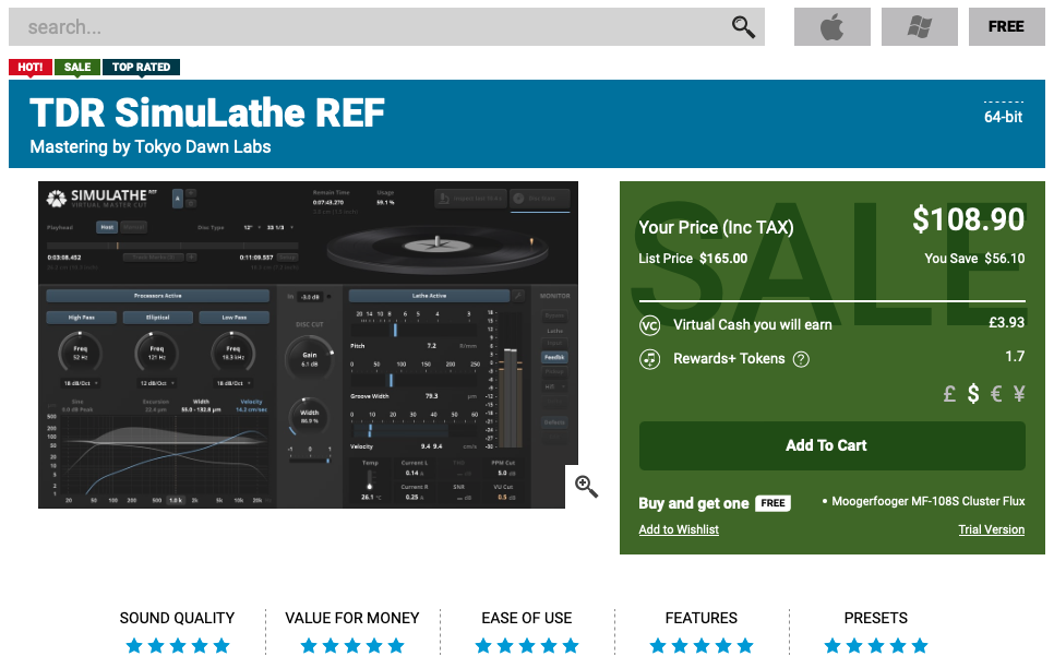 각설하고 이번에 리뷰할 플러그인은 TDR에서 개발한 최신 플러그인, SimuLathe다. 이름대로 Vinyl이 제작되는 과정을 시뮬레이션하는 플러그인이다. TDR SimuLathe는 REF와 CUT 총 2가지 버전이 판매되고 있는데, REF는 디스크 커팅 머신을 운용하고 있지 않은 사람들을 위한 플러그인이고. CUT은 디스크 커팅 머신을 실제로 운영하고 있는 사람들을 위한 플러그인이다. CUT 버전이 물론 디스크 커팅 머신을 위한 보정 옵션이 더욱 많이 들어가 있어 가격도 약간 더 비싸다. 필자가 이번에 소개할 플러그인은 TDR SimuLathe REF, 디스크 커팅 머신을 운용하고 있지 않은 사람들을 위한 플러그인이다. 물론 필자도 5인치 디스크 커팅 머신을 가지고 있긴 하지만 장난감 정도의 퀄리티라고 생각하고 있어서 REF 버전을 가져왔다. 가격은 공식 홈페이지 기준, REF 버전이 149달러, CUT 버전이 249달러 정도 한다. 그러나 플러그인 전문 샵에서 구매하면 REF 버전 기준으로 얼추 99달러 정도에 구입할 수 있다. Tokyo Dawn Record 홈페이지에서 데모 체험도 할 수 있어 필요한 사람은 체험 버전을 미리 사용할 수 있다.