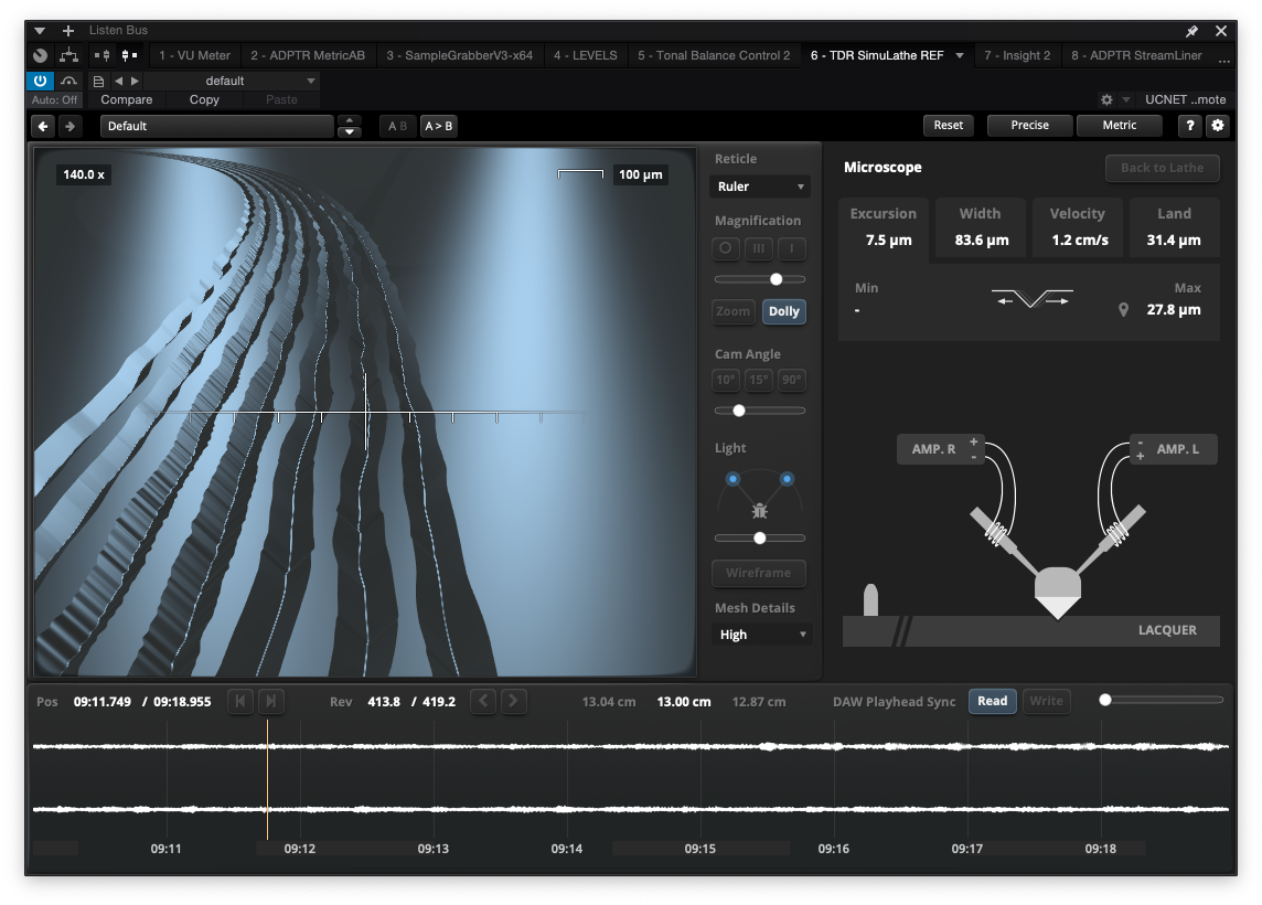 TDR SimuLathe REF는 Disc Stats 모드 말고도 또 다른 모드를 가지고 있는데, 바로 현미경 모드다. 현미경 모드는 재생 지점부터 최대 18초 되는 부분의 파형을 시뮬레이션해서 소릿골로 보여주는 기능이다. Disk Stats 모드와 비슷하지만, 현미경 모드는 실시간으로 데이터를 시뮬레이션해서 보여준다는 차이점이 있다. TDR에서는 현미경 모드에 꽤 자신이 있는지 Vinyl 디스크로 커팅했을 때의 모습을 거의 정확하게 시뮬레이션했다고 한다. 실제로 이렇게 커팅되는지는 한번 현미경으로 봐야 알겠지만, 커팅 머신 및 현미경이 없는 엔지니어에게는 어떤 방향으로 Vinyl 디스크가 커팅될지 미리 알 수 있어서 꽤 유용한 정보다. 또한 Disk Stats와 달리 소릿골 확인을 위한 조명도 조절할 수 있으며, 카메라의 각도, 가늠자 등 다양한 옵션을 제공한다. Disc Stats 및 현미경 모드, 다른 시뮬레이션 플러그인에서 찾아보기 힘든 흥미로운 기능이다.