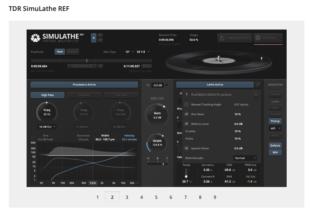TDR SimuLathe REF는 Vinyl 디스크 제작으로 고민하는 프로듀서 및 Vinyl 디스크 마스터링에 관심이 있는 마스터링 엔지니어들이 길잡이로 삼을 만한 플러그인이다. Vinyl 디스크의 크기 및 재생 속도 설정, 재생 헤드 및 소릿골의 에뮬레이션 등 다른 플러그인에서 찾아볼 수 없는 독보적인 기능들은 생소할 수도 있는 Vinyl 디스크 지식을 보조해준다는 느낌이 강했다. 필자가 Vinyl 디스크를 제작하려고 마음먹었을 때, 찾아봤던 사전 지식들은 디지털 CD를 만드는 것 이상으로 방대했다. 특히 CD와 같은 디지털 매체와 달리 소릿골에 바늘로 읽는 아날로그 매체라는 특징상 디지털 매체보다 제작할 때 고려해야 할 부분들이 많다. 재생 중 바늘이 튀지 않게 소릿골의 크기를 적당히 만드는 것부터 적절한 스테레오 주파수 유지하기, 저역의 럼블 등 디지털이었다면 문제도 되지 않았을 이슈들이 아날로그 매체의 마스터링에서는 문제가 될 수 있다. 그렇기에 TDR SimuLathe REF을 통해 LP 제작 시 문제가 될 수 있는 점들을 미리 시뮬레이션해 보고 즉석에서 수정하고, 다시 체크하는 등 시행착오를 줄여나갈 수 있다. 실물 판으로 실험하면 시행착오에 수많은 돈이 들어가지만 디지털 시뮬레이션은 그럴 필요 없으니까. TDR SimuLathe REF의 유일한 단점은, 전문가들을 위한 정보들을 제공하고 있기에 꽤 내용들이 어렵다. 필자도 아직 이해하지 못해서 계속 매뉴얼을 찾아 읽어보는 부분들이 존재한다. 그 밖에 개인적으로 느꼈던 아쉬운 점은, Disc Stats 모드에서는 Vinyl 디스크 소릿골에 불빛을 못 비춘다는 점이었다. 더욱 상세하게 소릿골을 확인하려면 현미경 모드를 쓰라는 의도가 있는데, 이왕 디지털로 시뮬레이션할 거였다면 Disc Stats에서도 소릿골에 불빛을 비춰주었다면 더더욱 좋을 듯하다. 일반 사용자 및 마스터링 엔지니어를 위한 REF 버전도 어려운데 Vinyl 커팅 공장을 위한 CUT 버전은 더 어렵다. 그쪽은 진짜 전문가를 위한 플러그인이니까 당연하지만.