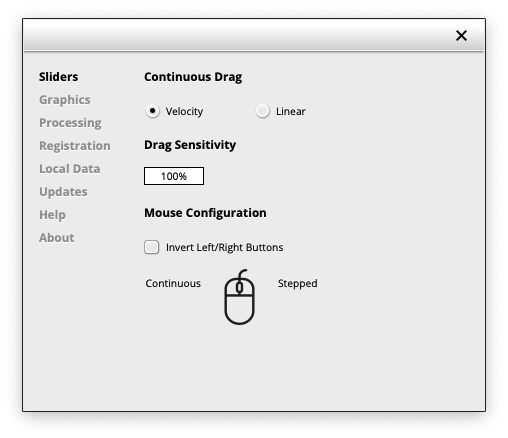 TDR SimuLathe REF의 기타 설정들은 우측 상단의 톱니바퀴 버튼을 누르면 나타난다. 그래픽 및 마우스 컨트롤에 대한 옵션, 업그레이드, 제품 등록 등 다양한 설정들을 제공한다. 가끔 필요한 경우가 있으니 미리 어떤 기능들이 있는지 미리 파악해 놓으면 좋다.